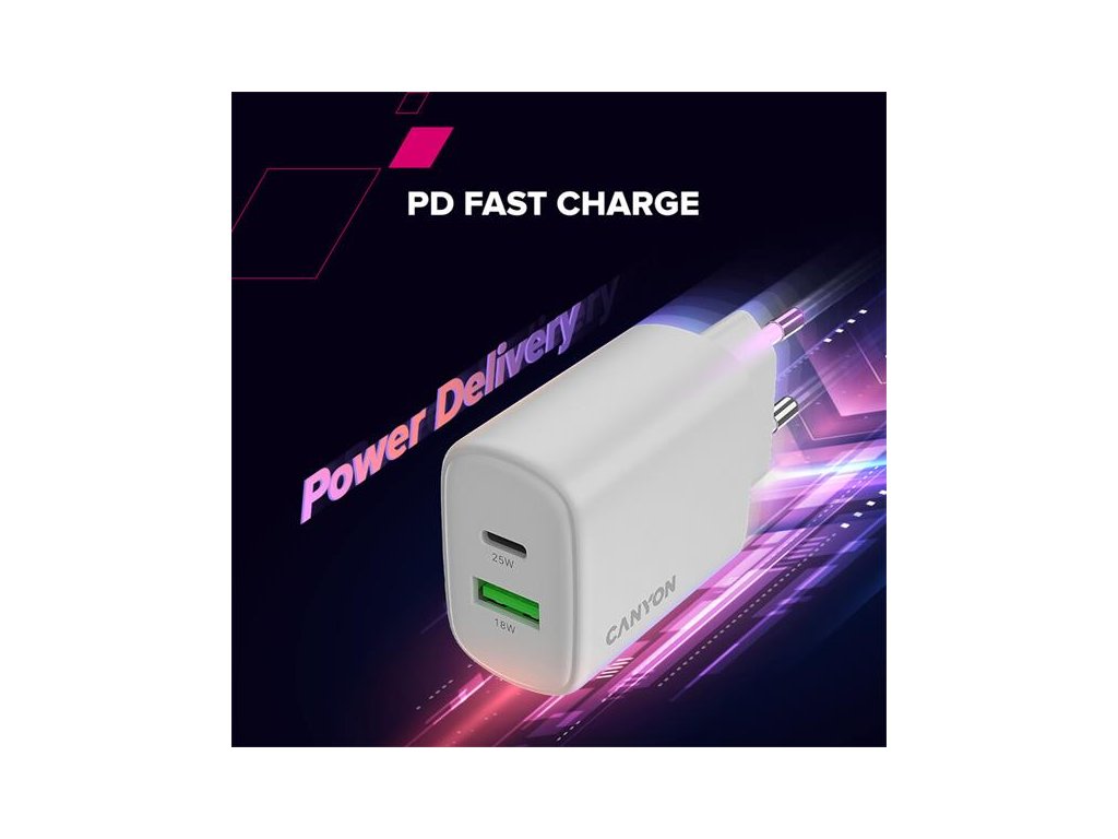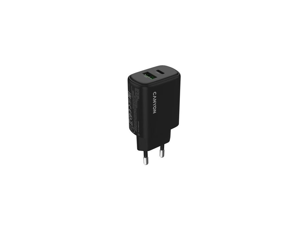 Canyon OnCharge 250, univerzálna nabíjačka do steny, 1x USB-C + 1x USB-A, PD 25W, čierna CNE-CHA250-31