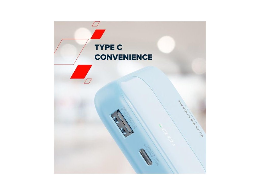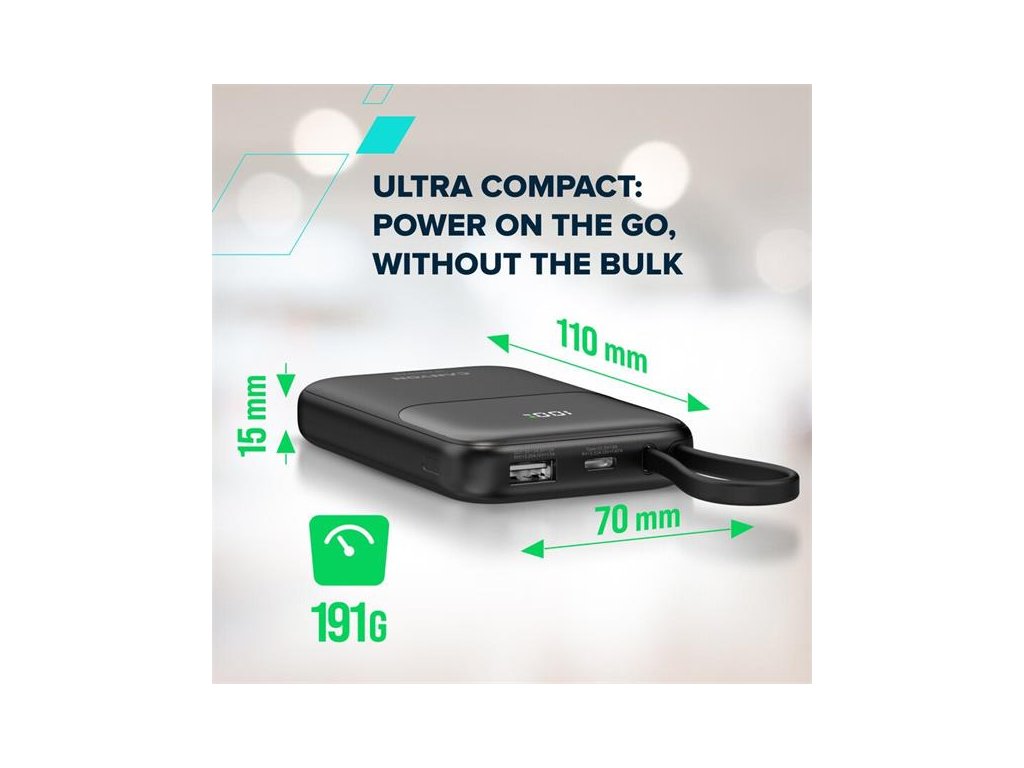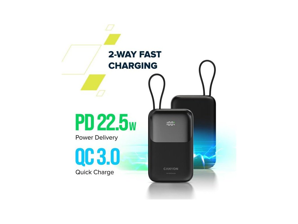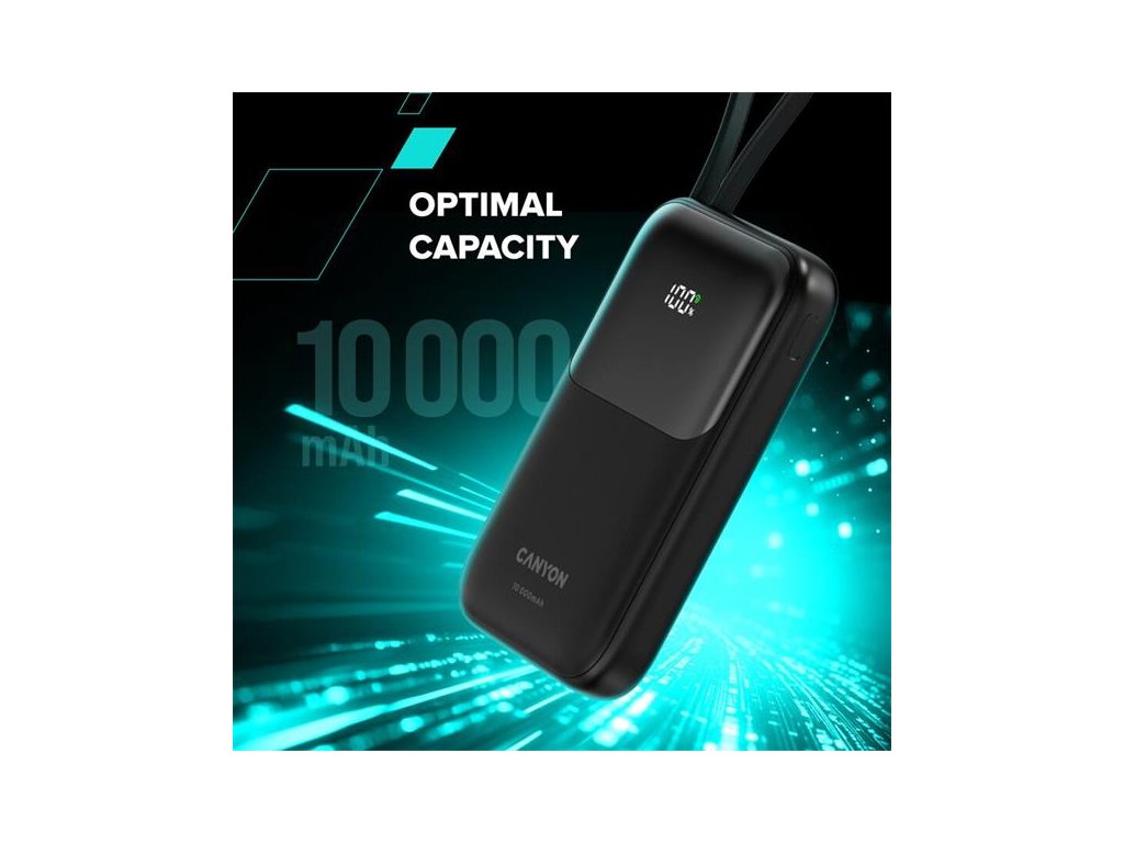 Canyon OnPower 101, Powerbank, 10.000 mAh, dig. disp., in: USB-C, out: USB-A, QC 3.0/USB-C, PD 22,5W, integ. káb.. CNS-CPB101PU