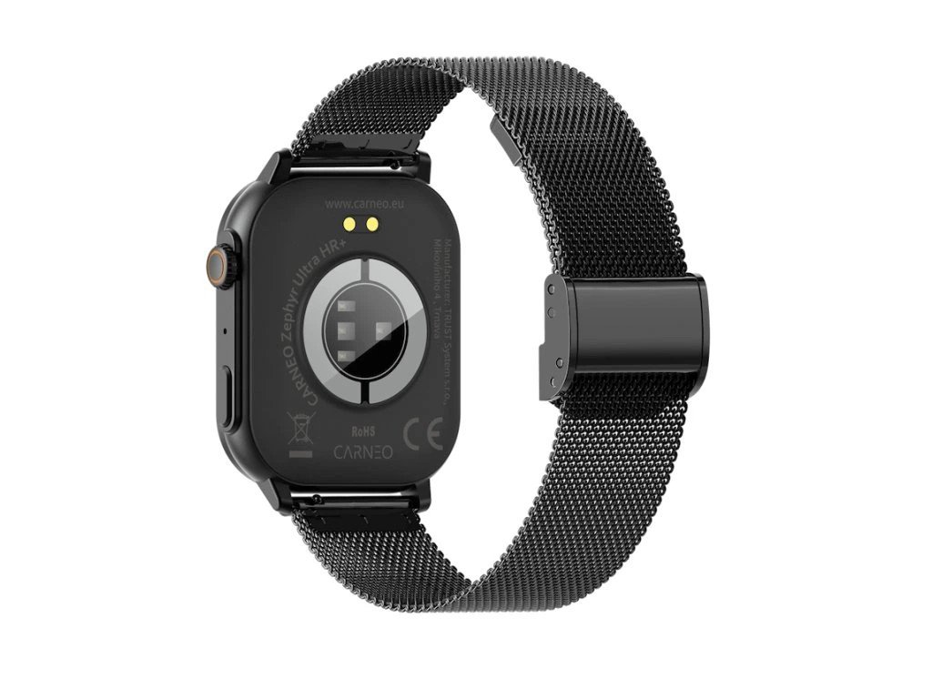Moderní, designově propracované fitness hodinky CARNEO Zephyr Ultra HR+ v černé barvě s černým, kovovým, pleteným řemínkem a barevným SUPER AMOLED displejem s vysokým jasem a funkcí trvalého zobrazení času. Monitorují vaši denní aktivitu, úroveň stresu a lze je spárovat s mobilním telefonem díky čemuž Vás upozorní na příchozí hovor nebo SMS. Hodinky umožňují telefonovat, aniž byste museli telefon vyndat z tašky, díky vestavěnému mikrofonu a reproduktoru až do vzdálenosti 10 m od telefonu. Jejich bezchybné kovové tělo s nadčasovými outdoorovými křivkami je tak návykové, že je po prvním nošení nebudete chtít sundat ze zápěstí. Tvrzené minerální sklo ochrání jejich křišťálově čistou obrazovku před poškrábáním. Hodinky jsou dodávány se silikonovým řemínkem v černé barvě příjemným na dotek, který jim dodává sportovní vzhled. Vkusný outdoorově-luxusní design se snadno kombinuje k obleku či volnočasovému outfitu. Hodinky i aplikace jsou kompletně v češtině, takže si budete jistě spolu dobře rozumět. Operační systém: IOS a Android Displej - úhlopříčka [palce]: 2,04'' dotykový AMOLED Displej - rozlišení [pix]: 368 x 448 Materiál řemínku: Kovový, pletený/ Silikonový náramek Materiál hodinek: Kov Velikost hodinek: 40 x 46 mm Tloušťka hodinek: 10 mm Šířka řemínku: 22 mm Konektivita: Verze Bluetooth: V 5.2 Voděodolnost: IP 67 Měřené veličiny: *Krokoměr: ano *Měření vzdálenosti: ano *Měření krevního tlaku: ano *Měření okysličení krve: ano *Měření spálených kalorií: ano *Kardio index: ano *Úroveň stresu: ano *Výpočet BMI: ano *Monitor Spánku: ano *Energie těla: ano *Aplikace: Carneo FIT v českém jazyce *Přehrávání hudby: Ovládání hudebního přehrávače v mobilním telefonu Baterie: Kapacita [mAh]: 280 mAh Životnost baterie: 7 dní Hmotnost [g]: 38 g Obsah balení: *1 x Chytré hodinky CARNEO Zephyre Ultra HR+ *1 x Magnetický napájecí kabel *1 x Uživatelská příručka