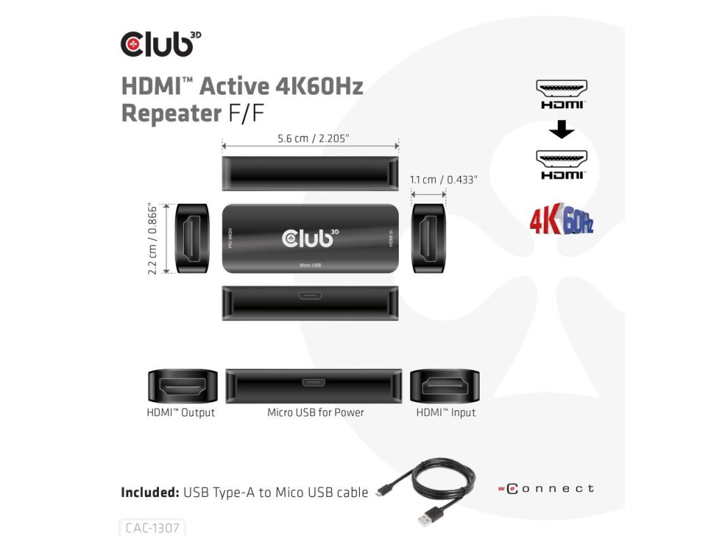 Club3D Adaptér aktivní HDMI 4K60Hz (F/F), černá CAC-1307 Club 3DŠpecifikácia kábla / redukcie:Adaptér, Redukce; Input:HDMI