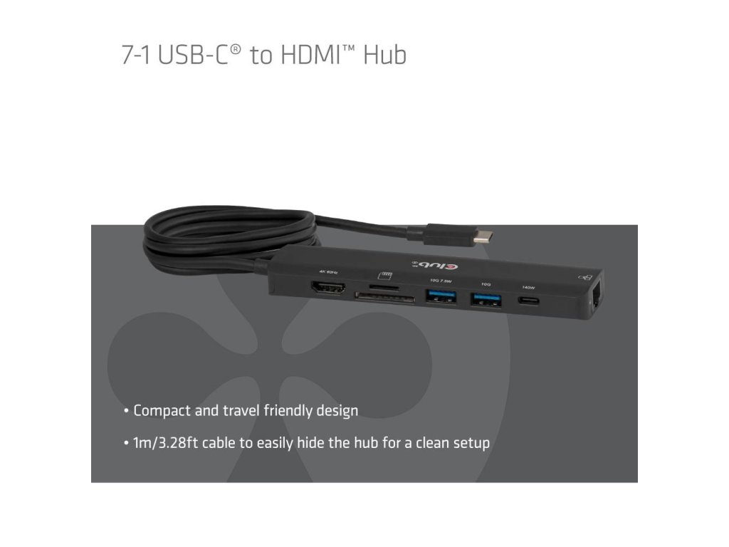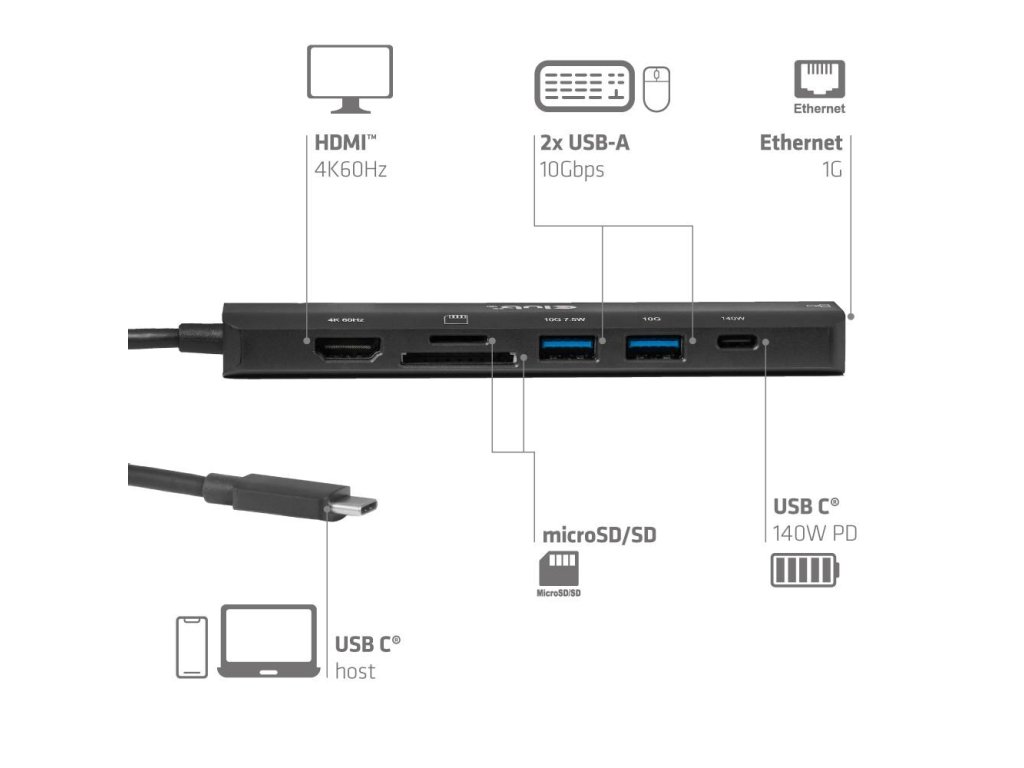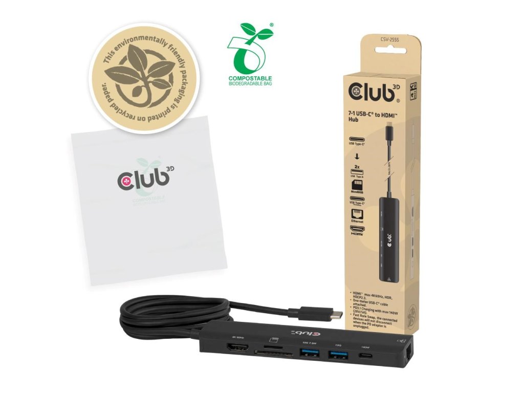 Club3D hub USB-C, 7-in-1 hub s 2x USB, 1xHDMI, 1xUSB-C PD, RJ45, microSD/SD, 140W, 4K60Hz, 1m kabel CSV-2555 Club 3D