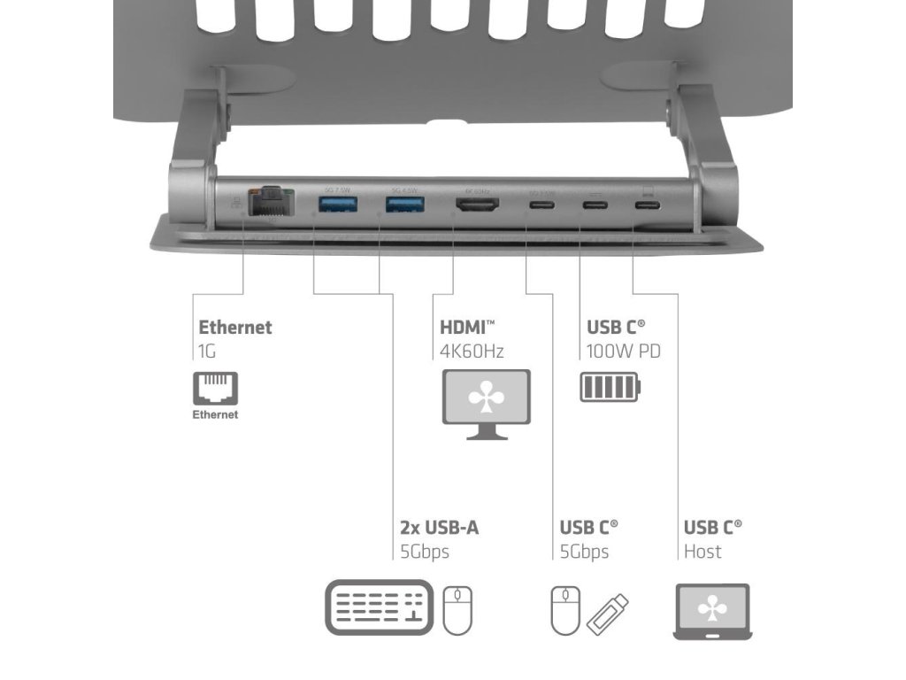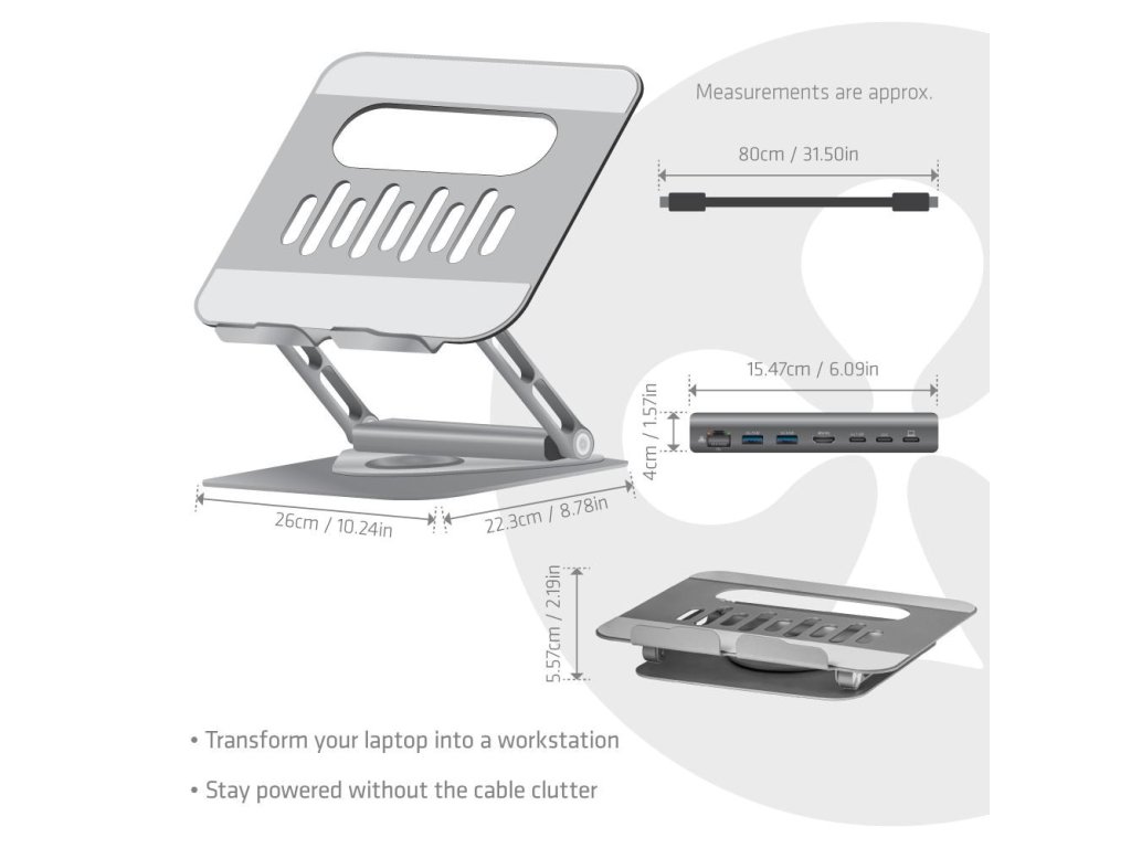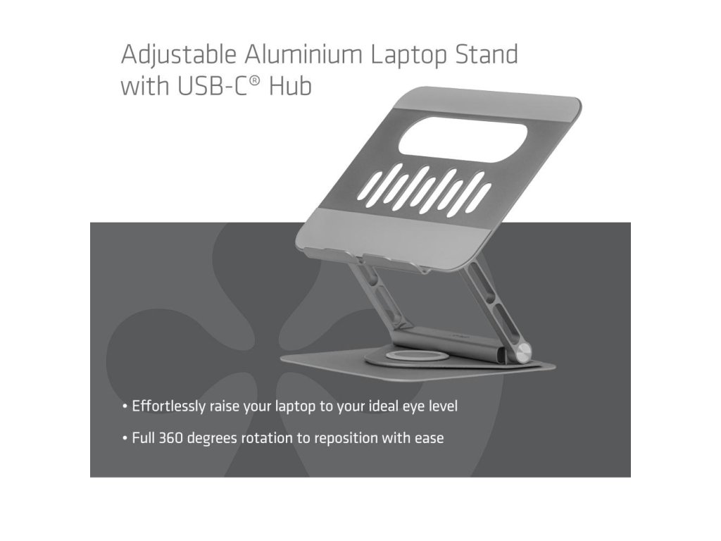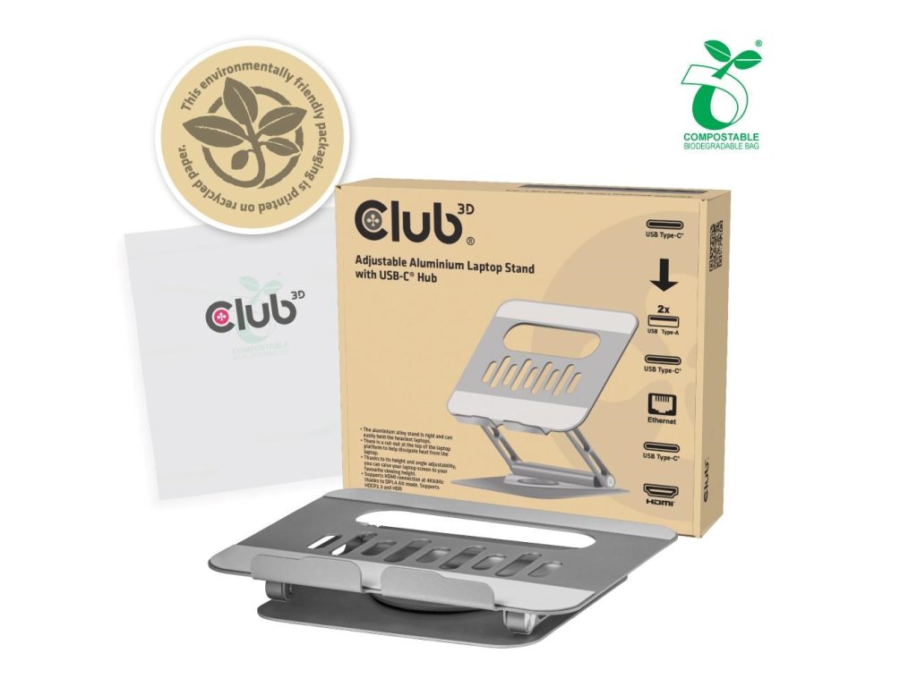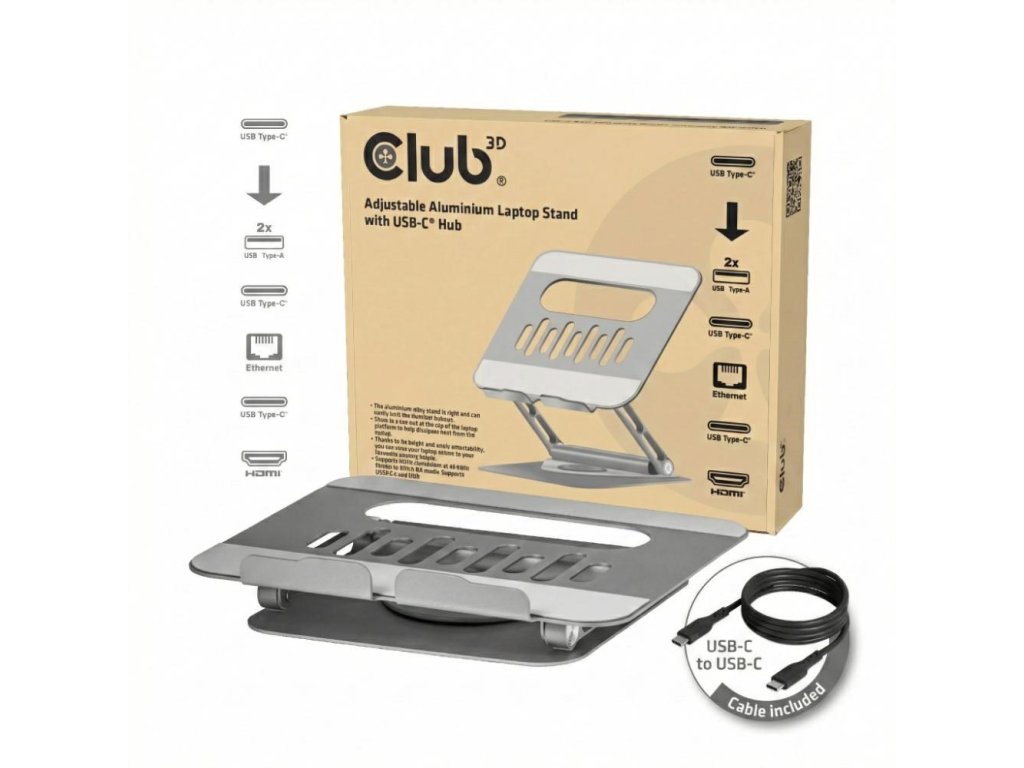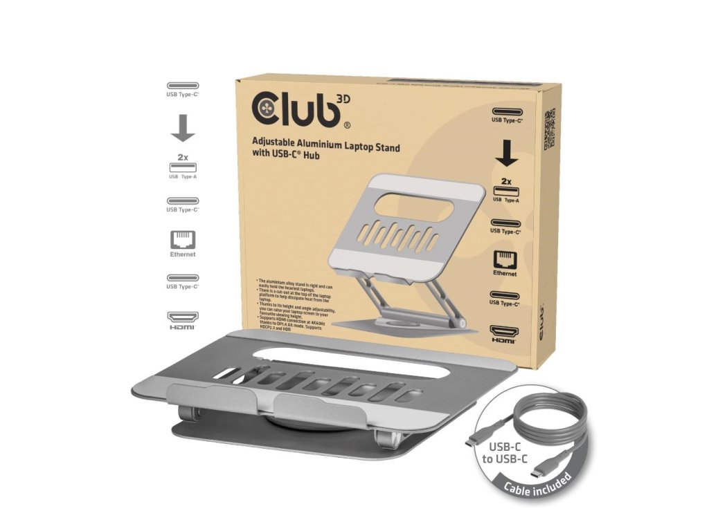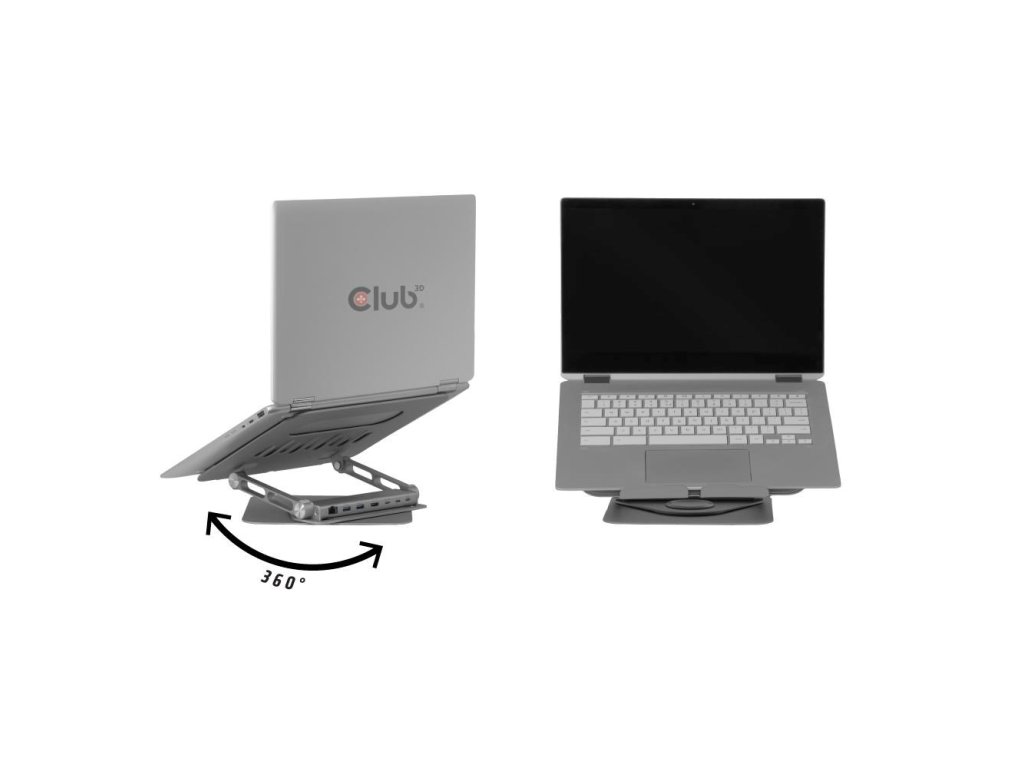 Club3D Nastavitelný hliníkový stojan pro notebook s USB-C hubem na 2xUSB, 1xHDMI, 2xUSB-C, 1xRJ45, 360°, 100W, 4K60Hz CSV-2554 Club 3D