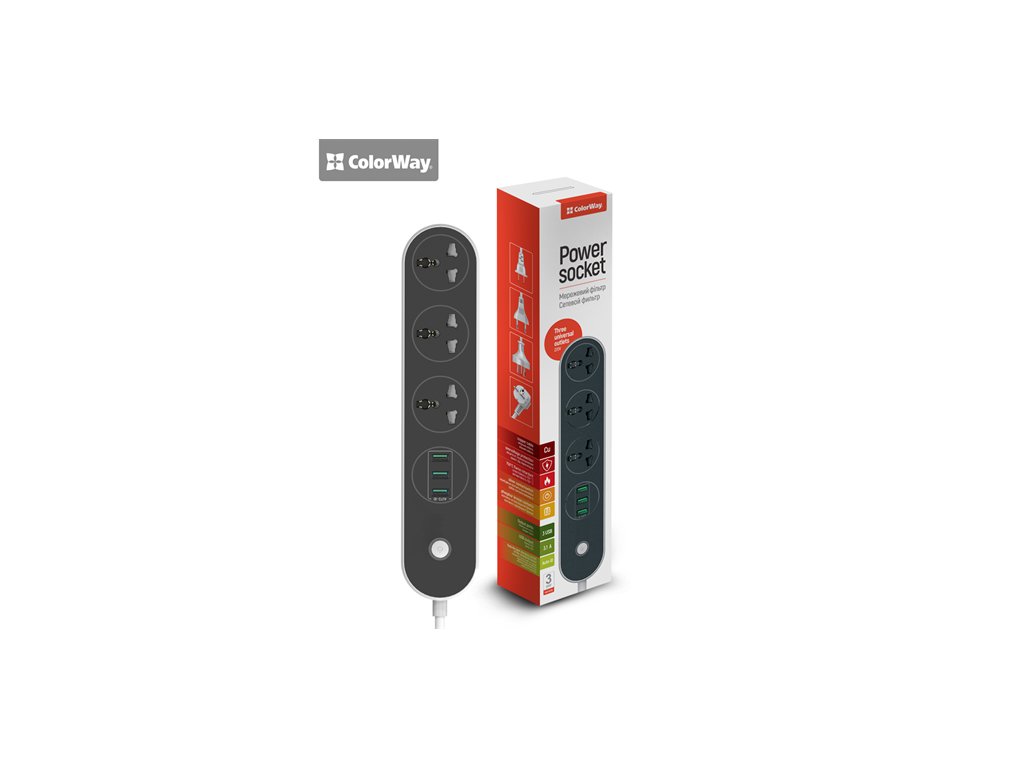 ColorWay CW-CHU33B - predlžovací kábel, 3x eurozásuvka, 3x USB, čierna, 1,8m