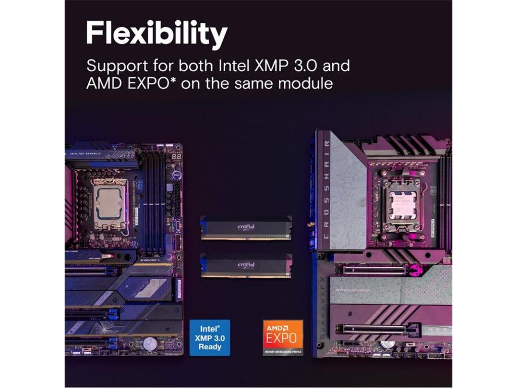 Push performance to the next level with the blazing speed and massive bandwidth of Crucial DDR5 Pro OC Gaming Memory. Mobilize the power of low latency to beat the clock and fuel your next win instead of worrying about performance bottlenecks. This powerful, high-performance memory supports next-gen multi-core CPUs and stable overclocking with Intel® XMP 3.0 and AMD EXPO™. Available in black or white.