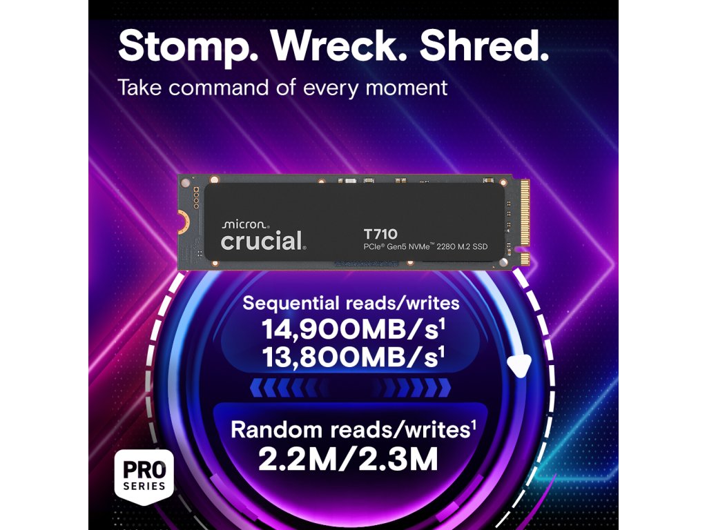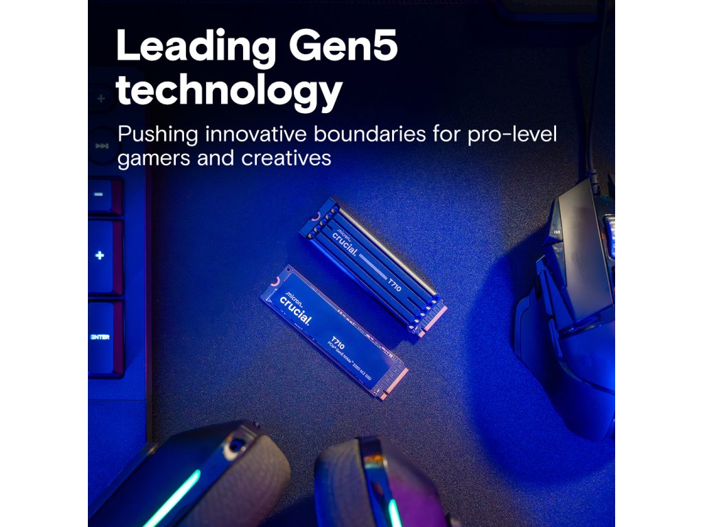 Crucial T710 1TB PCIe Gen5 NVMe 2280 M.2 SSD Nekompromisní výkon Gen5 pro profesionální hráče a tvůrce Parametry *SSD Series: T710 *Rozhraní: NVMe (PCIe Gen 5 x4) *Total Density: 1TB *Kit Quantity: 1 *Form Factor: M.2 (2280) *Sekvenční zápis: 13700 MB/s *Sekvenční čtení: 14900 MB/s Záruka: 5 let
