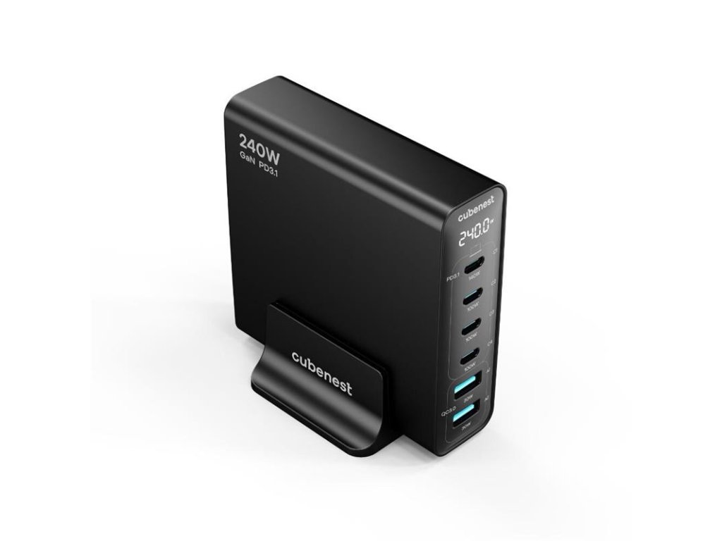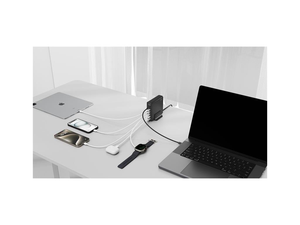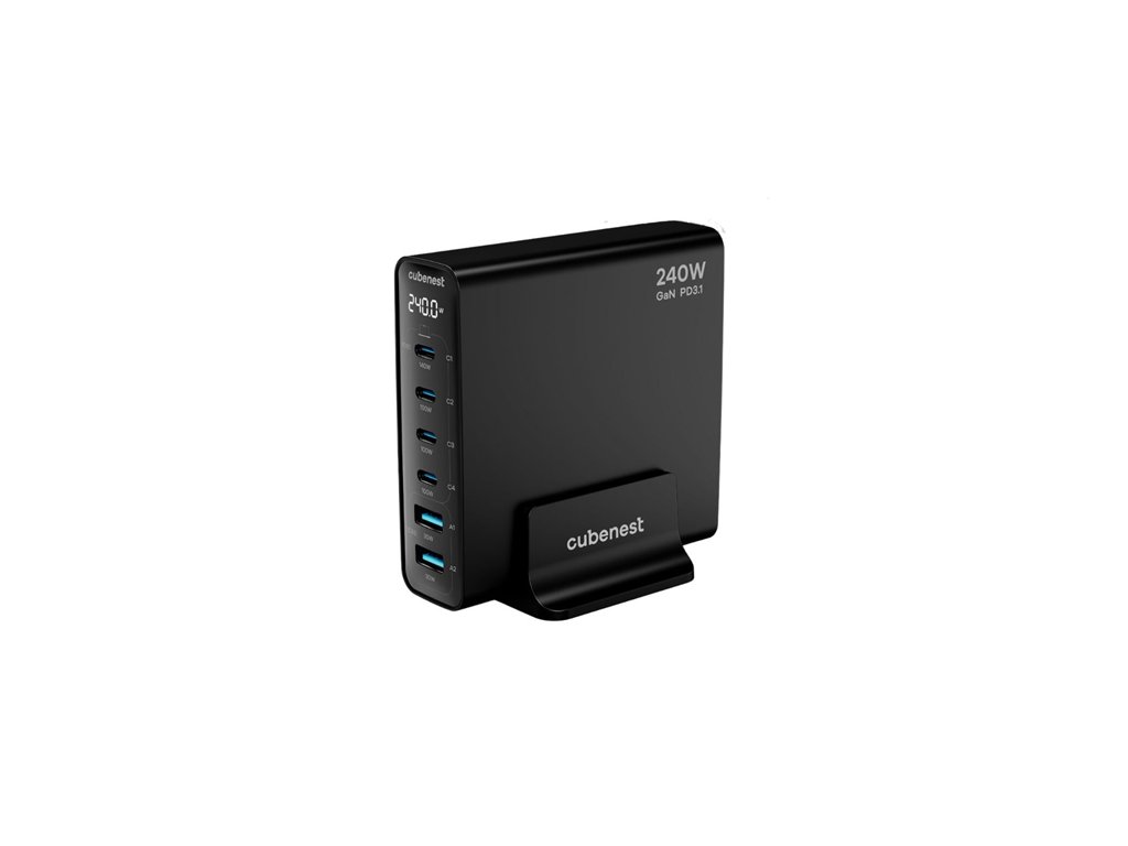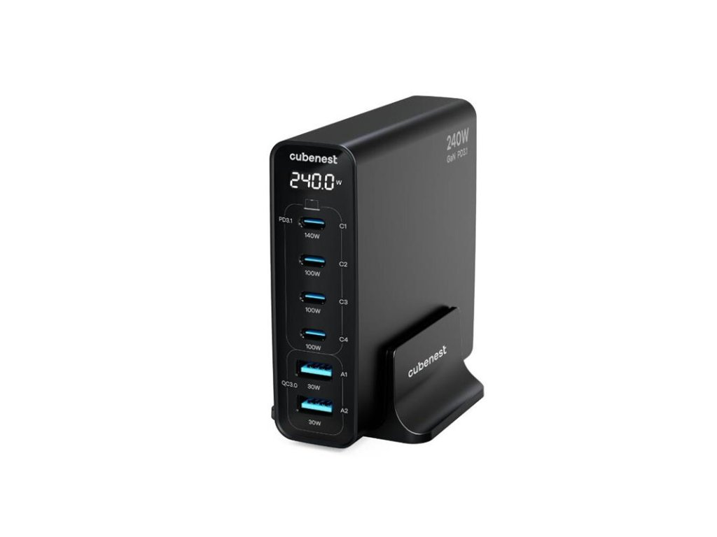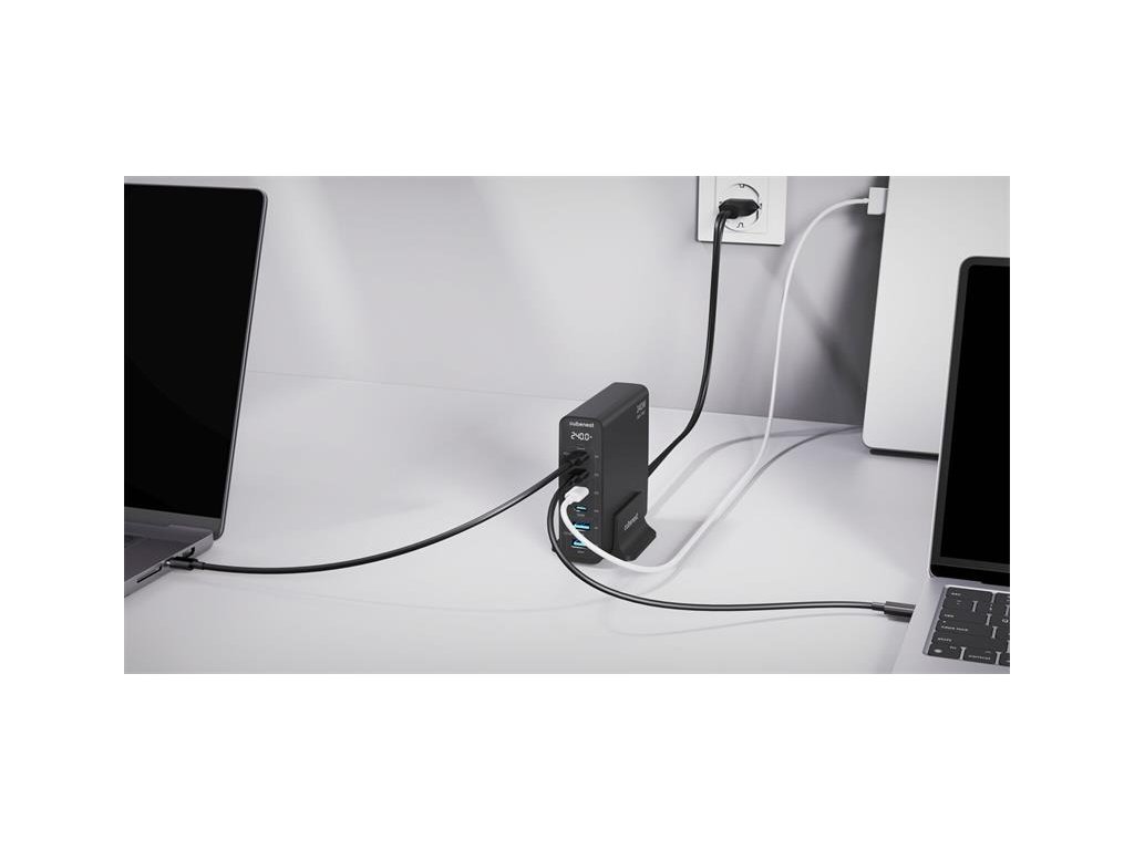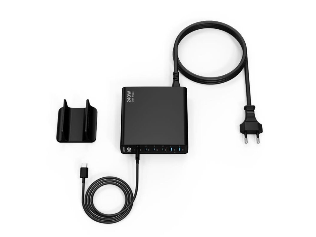 Nabíjačka je vybavená celkom 6 USB portami (4x USB-C a 2x USB-A), ktoré umožňujú pripojiť a nabíjať rôzne zariadenia súčasne. Vďaka použitiu najmodernejšej GaN technológie namiesto tradičných kremíkových polovodičov zaisťuje rýchle, bezpečné a účinné nabíjanie vašich zariadení. S maximálnym výkonom až 240 W a podporou širokého spektra technológií si môžete byť istí, že vaše zariadenia budú nabité rýchlo a spoľahlivo.