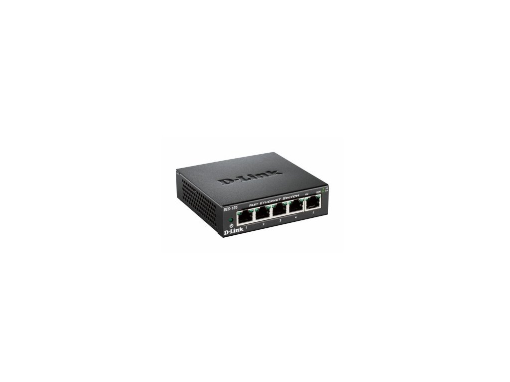 DES-105 Fast Ethernet neřízený stolní přepínač je osazen 5 porty 10/100 Mb/s pro rychlé vytvoření sítě pomocí kabelů. Připojte k DES-105 více počítačů a sdílejte soubory a složky, nebo jej připojte k routeru pro sdílení internetového připojení. Bez nutnosti konfigurace přepínače.
