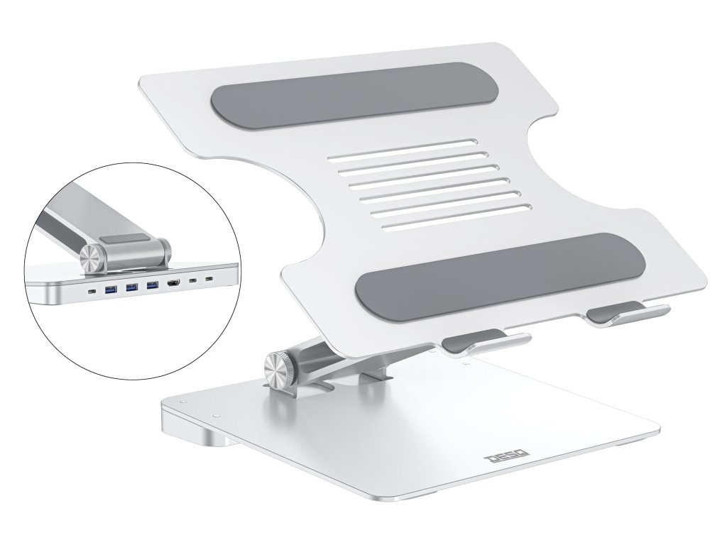 - Plně a snadno nastavitelná hliníková konstrukce s 6ti porty - Velikost notebooku až 15,6'' - 3x slot na USB 3.0-A, 1x HDMI, 1x USB 3.0-C, 1x USB-C-PD (Input), 1x USB-C (Host) - Protiskluzový povrch s odvětracími otvory pro lepší chlazení notebooku - Lehká, skládací hliníková konstrukce pro lepší mobilitu - Nastavení v libovolném úhlu až do 70° a možností mít notebook v rovině nebo vyvýšený až o 280 mm - Konektivita: 1x USB-C HOST s podporou Thunderbolt 3 1x USB-C PD max 100W, 85W pro nabíjení 2x USB-A 3.0 1x USB-A 3.0 BC 1.2 Quick charging 1x HDMI 1.4 4K/30Hz 1x USB-C 3.0 UASP s nabíjením 5V/0.9A - Rozměr 274 x 215 x 45,3 mm (složený) - Váha 1191 g - Součástí balení je propojovací kabel USB-C/USB-C
