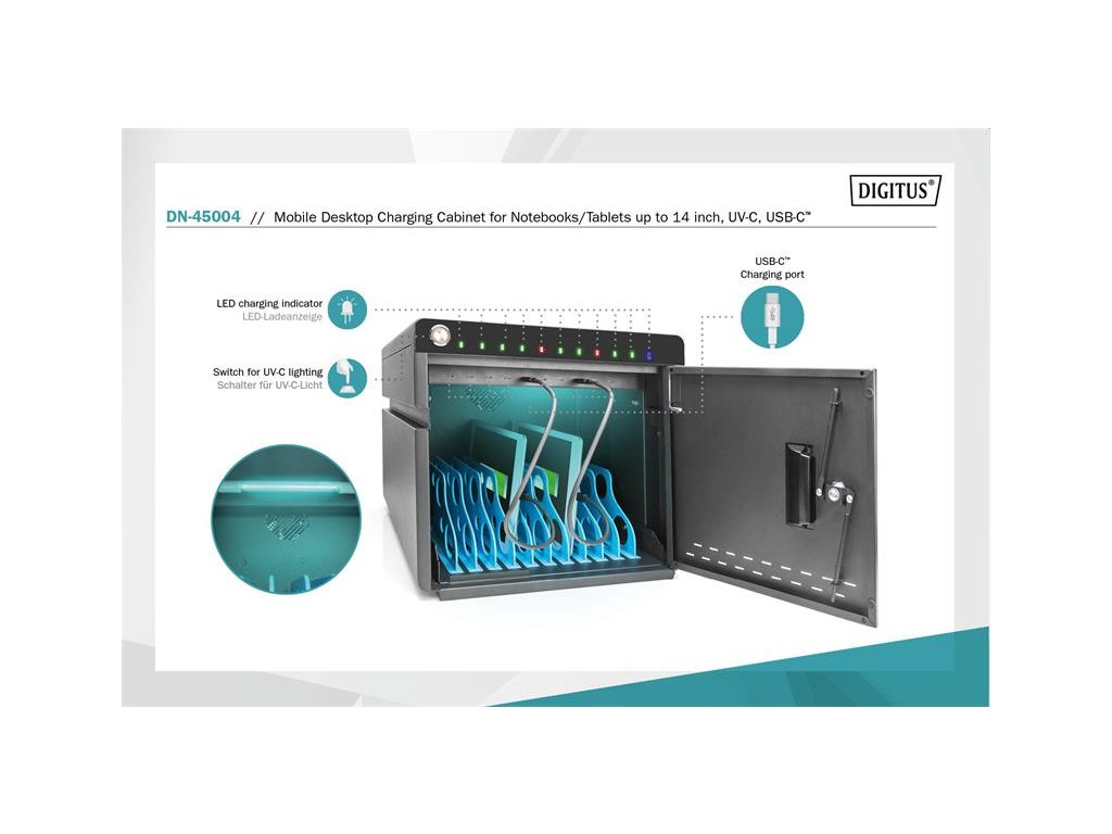 DIGITUS mobilní stolní nabíjecí skříňka pro notebooky/tablety do 14 palců, 10 zařízení. UV-C, USB-C ( až 20W na zařízení) DN-45004 Digitus