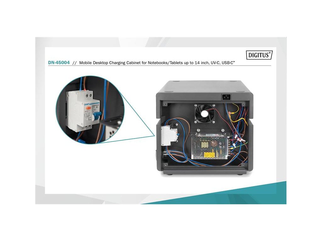 Mobilní nabíjecí skříň DIGITUS je opatřena ventilačními štěrbinami a ventilátorem s teplotním čidlem, které brání přehřívání a zajišťují tak bezpečný provoz. Pokud vnitřní teplota skříně překročí 40 °C, ventilátor se automaticky sám spustí.