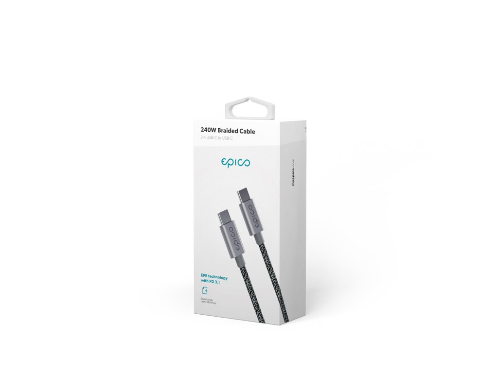 Napájecí kabel, 2x USB-C konektor, výkon až 240W, podpora EPR (Extended Power Range), přenos dat 480Mb/s, délka 2m, nylonové opletení, hliníkové koncovky, barva vesmírně šedá. Epico 240W Braided Cable USB-C to USB-C je výkonný kabel s výjimečnými nabíjecími schopnostmi. Je vybaven technologií EPR (Extended Power Range), která mu umožňuje dosáhnout maximálního nabíjecího výkonu až 240W. Kovové koncovky pomáhají ochlazovat součástky a zajišťují bezpečnost a maximální účinnost. Vysoce kvalitní nylonové opletení je odolné vůči napínání a zajišťuje dlouhou životnost. Typ: USB-C na USB-C, Maximální výkon: 240 W, Délka: 2 m, Materiál: hliník, látkové opletení, Hmotnost: 40 g
