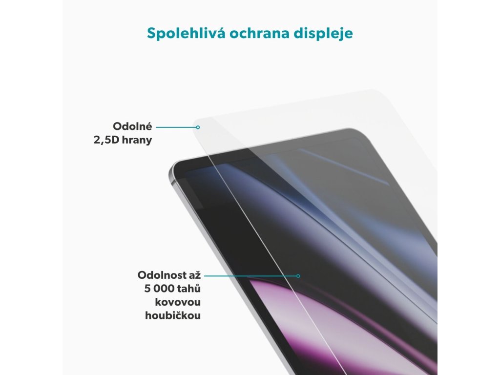 Každodenní ochrana pro váš iPad s extra snadnou instalací Epico Glass Screen Protector poskytuje spolehlivou ochranu displeje a zároveň snadnou instalaci bez komplikací. Díky jedinečnému aplikátoru proti prachu je sklo předem připravené k nalepení. Stačí vložit iPad do zásobníku – jedním tahem aplikátor odstraní veškerý prach a sklo perfektně přilne. Aplikátor je vyroben z papíru a lze ho po použití jednoduše recyklovat. Odolný a elegantní design Ochrana displeje s tvrdostí 5 Mohs (9H) prokazatelně odolá až 5 000 pohybům kovovou houbičkou, takže váš displej zůstane bezpečně chráněný před každodenním opotřebením. Zachovává přirozenou ostrost a věrné barvy, čímž zajišťuje čistý a nezkreslený obraz. Ultratenký profil o tloušťce pouhých 0,33 mm nepřidává žádný objem navíc a speciální vrstva proti otiskům prstů udržuje obrazovku bez šmouh. Díky 2,5D provedení s jemně zaoblenými hranami sklo plynule navazuje na tělo iPadu a je odolnější proti odštípnutí než běžná 2D ochranná skla.