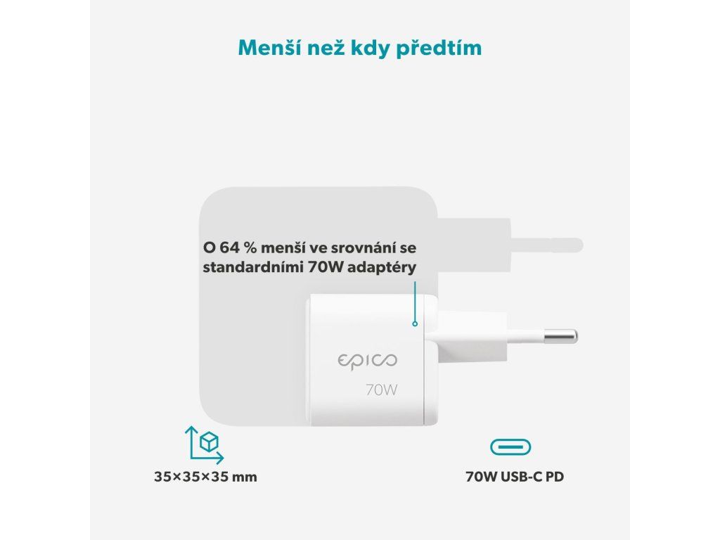 Maximální výkon v ultra kompaktním provedení Nabíječka Epico UltraBoost Micro AVS GaN 70W Dynamic Wall Charger EA70b přináší vysoký nabíjecí výkon až 70 W v překvapivě kompaktním provedení. Bez problémů zvládne rychlé dobíjení i náročnějších zařízení včetně notebooků, přičemž iPhone 17 Pro nabije na 50 % za pouhých 20 minut. Díky podpoře technologie Power Delivery je navíc přenos energie efektivní a optimalizovaný. Chytré a bezpečné nabíjení pro každý den Oproti běžným 70W adaptérům má nabíječka až o 64 % menší rozměry, což oceníte při každodenním přenášení i cestování. Moderní GaN technologie snižuje zahřívání a zvyšuje celkovou účinnost, zatímco dynamické nabíjení AVS & DPS se aktivně přizpůsobuje aktuálním potřebám připojeného zařízení. Výsledkem je rychlé, šetrné a bezpečné nabíjení, podpořené pokročilými ochrannými prvky proti zkratu, přepětí, přetížení i přehřátí.