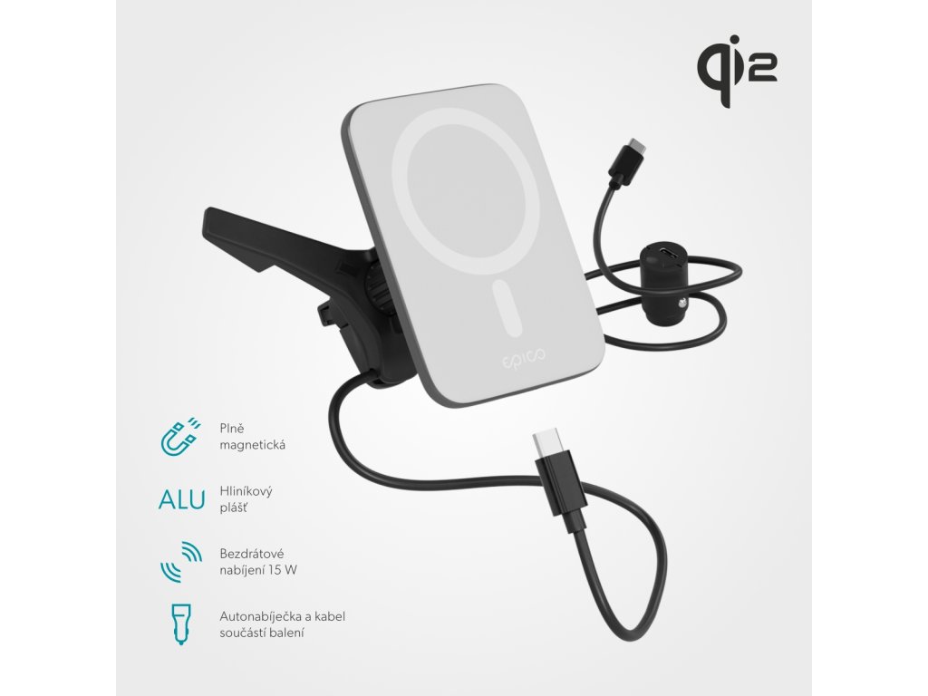 Qi2 držák na mobilní telefon - do auta, magnetický, uchycení do ventilace, výkon 15 W pro iPhone i Android, barva bílá/stříbrná. Až 2x rychlejší nabíjení s Qi2 Kompatibilita s MagSafe & Qi2: Bezproblémová kompatibilita s MagSafe & Qi2 umožňuje snadné bezdrátové nabíjení. Silný magnet: Zajišťuje bezpečné uchycení vašeho smartphonu. Qi2 bezdrátový výstup: Efektivní bezdrátové nabíjení s maximálním výkonem 15 W, až 2x rychlejší než standardní Qi nabíjení. Hliníkové tělo: Prémiové a odolné hliníkové tělo zabraňuje přehřívání. Ultratenký design: Pouze 7 mm tenká nabíječka nabízí velkou kontaktní. Flexibilní polohování: Po upevnění do větrací mřížky snadno nastavíte polohu pomocí kulového kloubu. Kompletní balení: Součástí je 20W autonabíječka a kabel USB-C na USB-C.