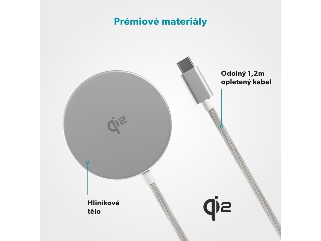 Bezdrátová nabíječka, certifikace Qi2, podpora MagSafe, výkon 15W, integrovaný 1,2m kabel USB-C. Rychlé a bezpečné nabíjení s Qi2 Certifikace Qi2 & kompatibilita s MagSafe Užijte si rychlé 15W bezdrátové nabíjení díky technologii Qi2 i pro iPhony. Nabíjejte až 2× rychleji než s běžnými Qi nabíječkami. Silný magnet: Udrží váš telefon bezpečně na místě a zároveň umožní pohodlné používání bez přerušení nabíjení. Hliníkové tělo: Elegantní a odolný design skvěle doplní váš telefon, ať už nabíječku používáte kdekoli. Integrovaný opletený kabel: 1,2m USB-C kabel s textilním opletem pro větší odolnost a snadné použití bez zamotávání.