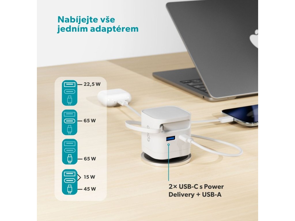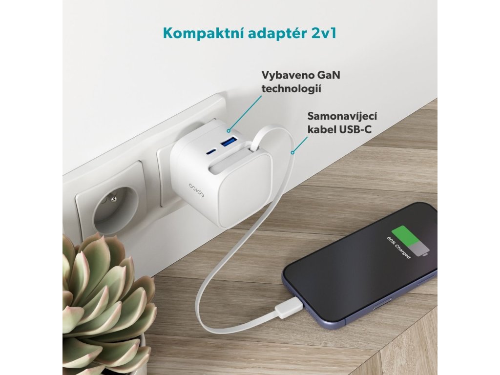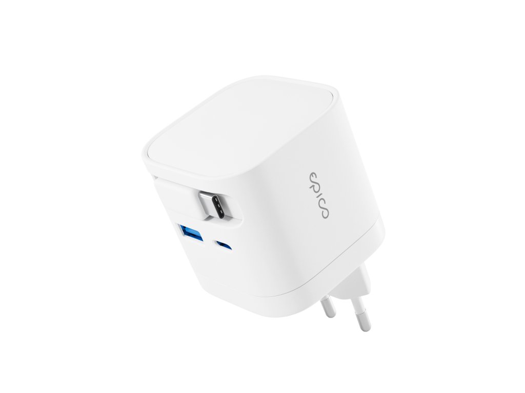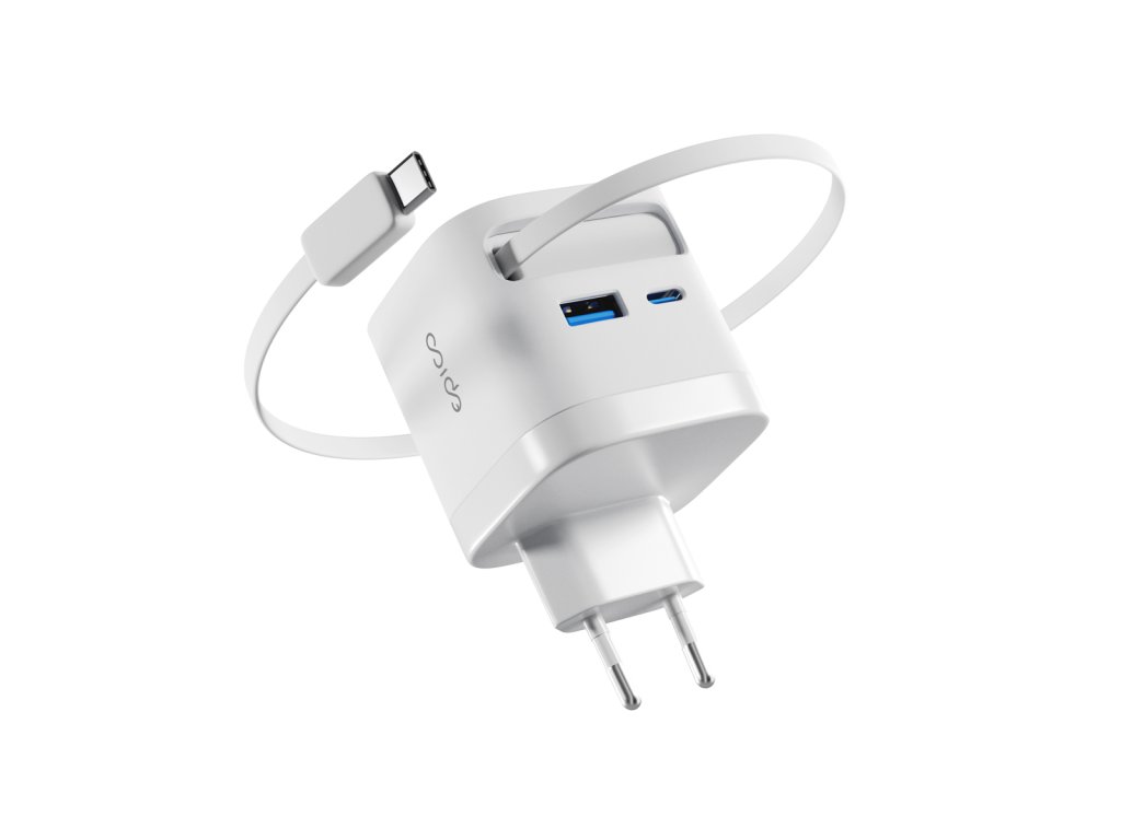 Praktická 2v1 nabíječka s vestavěným kabelem Epico UltraBoost EA65c přináší chytré a elegantní řešení pro každodenní nabíjení. Už žádné ztracené kabely – integrovaný USB-C kabel o délce 70 cm se snadno zasouvá přímo do těla adaptéru a je tak vždy po ruce. Magnetický konec se pevně přichytí na bok nabíječky, takže se kabel nikdy nezamotá. Vysoký výkon 65 W zajistí rychlé a efektivní nabíjení telefonu, tabletu, notebooku i další náročnější elektroniku. Nabíjejte až 3 zařízení současně Vestavěný USB-C kabel, port USB-C a USB-A umožňují nabíjet až tři zařízení zároveň. Technologie GaN zajišťuje vysokou účinnost a menší zahřívání pro pohodlné každodenní používání. Díky kompaktnímu a lehkému designu se skvěle hodí na cesty, do kanceláře i na domácí použití. O bezpečnost se starají vestavěné bezpečnostní prvky, které chrání proti zkratu, přepětí, přetížení a přehřátí, takže máte vždy jistotu bezrizikového nabíjení