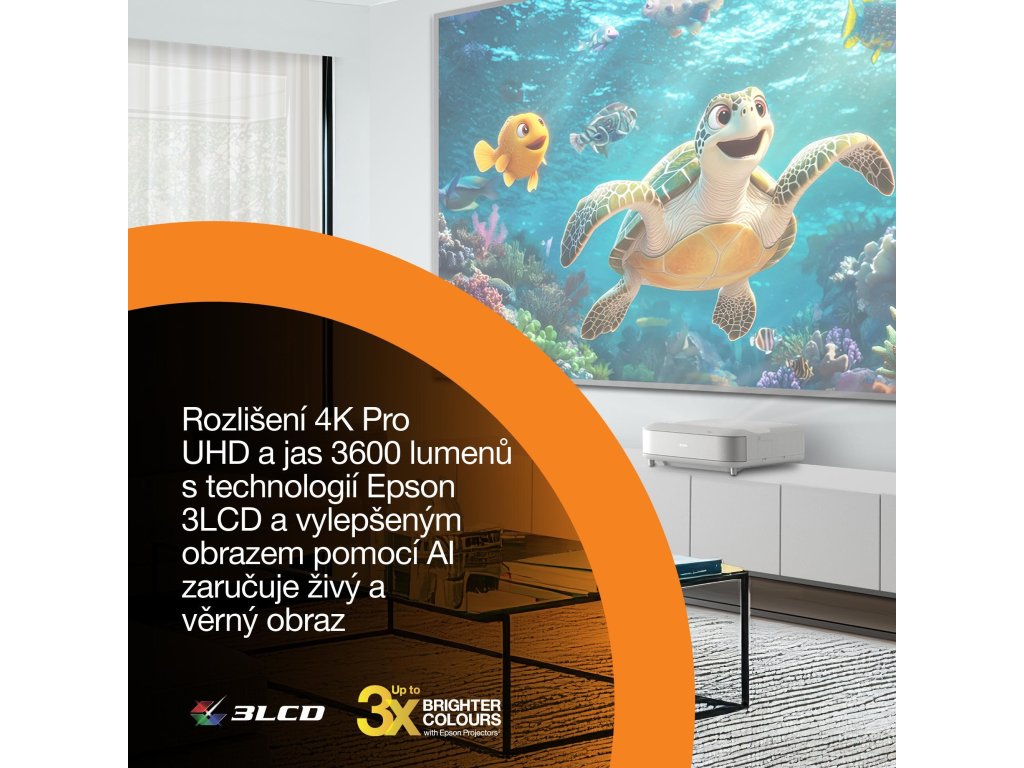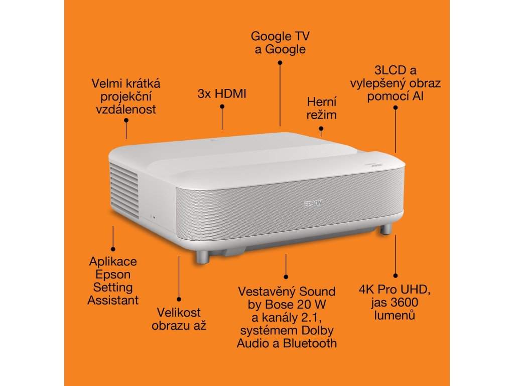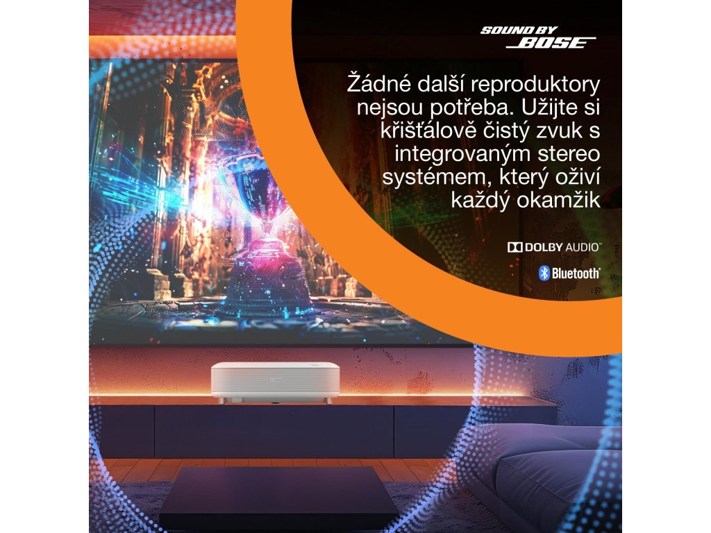 Použitie projektora: Domáce kino / hranie hier / streamovanie / televízie a set-top boxy; Typ projekcie: Ultra Short Throw (UST); Skutočné rozlíšenie projektora: 4K PRO-UHD (3840 × 2160); Projekčný pomer: 16:9; Projekčná vzdialenosť (min) (m): 0,3; Projekčná vzdialenosť (max) (m): 0,7; Uhlopriečka obrazu (max) ("): 120; Technológia: 3LCD (RGB so uzávierkou s kvapalnými kryštálmi C2 Fine); Zdroj svetla: Laser (životnosť až 20 000 h); Kontrast (hodnota : 1): 5 000 000; Jas (ANSI luse +) Dolby Audio + Bluetooth (20 W 2.1 kanálový systém);