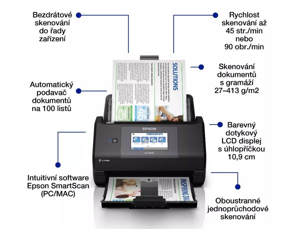 EPSON Workforce ES-590W Bezdrátový skener s ,automatickým podáváním listů Technické paramtery: Technologie Typ skeneru: Skener s podavačem Optické rozlišení (ADF): 600 dpi x 600dpi Skenovací oblast: 215,9 x 6,096mm Max. velikost dokumentu ADF: 215,9 x 6,096mm Formáty papíru: A4, A5, A6, B5, B6 Letter, Legal, Pohlednice, Vizitky, Plastové karty Hloubka barev (vstup): 30 bitů barva / 8 bitů černobíle Hloubka barev (Výstup): 24 bitů barva / 8 bitů černobíle Skenovací objem: 5 000 stran za den Rozhraní: Wi-Fi direct, Hostitel USB, USB 3.2 Gen1x1, Bezdrátová síť LAN IEEE 802.11a/b/g/n/ac Skener Optický senzor: CIS (Kontaktní snímač obrazu) Zdroj světla: Technologie ReadyScan LED Výstupní rozlišení: 75, 100, 150, 200, 240, 300, 600, 1200 dpi LCD Displej: Barvná dotyková obrazovka s uhlopříčkou 10,9cm Rychlost skenování Černobíle: 45 str./min. Barva: 45 str./min. Černobíle: 90 str./min. (při rozlišení 300 DPI) Barva: 90 str./min. (při rozlišení 300 DPI) Zpracování papíru/médií Kapacita papíru ADF: 100 listů Gramáž papíru ADF: Automatické podávání: 27 - 413g/m2 Duplexní skenování: Ano Funkce *Nezávislý provoz *Odstranění/vylepšení barev RGB *Pokročilá funkce odstranění/vylepšení barev *Přeskočení prázdných stran *Předdefinovaná nastavení *Automatická korekce zkosení *Automatická rotace obrazu *Vylepšení textu *Scan to Cloud Storage Obecné informace Napájení: ,AC 100 V - 240 V, 50 Hz - 60 Hz Spotřeba [W]: 14 Spotřeba ve stand by režimu [W]: 0,9 Rozměry (ŠxHxV): 296 x 169 x 167 Hmotnost: 3,7kg Záruka: ,2 roky