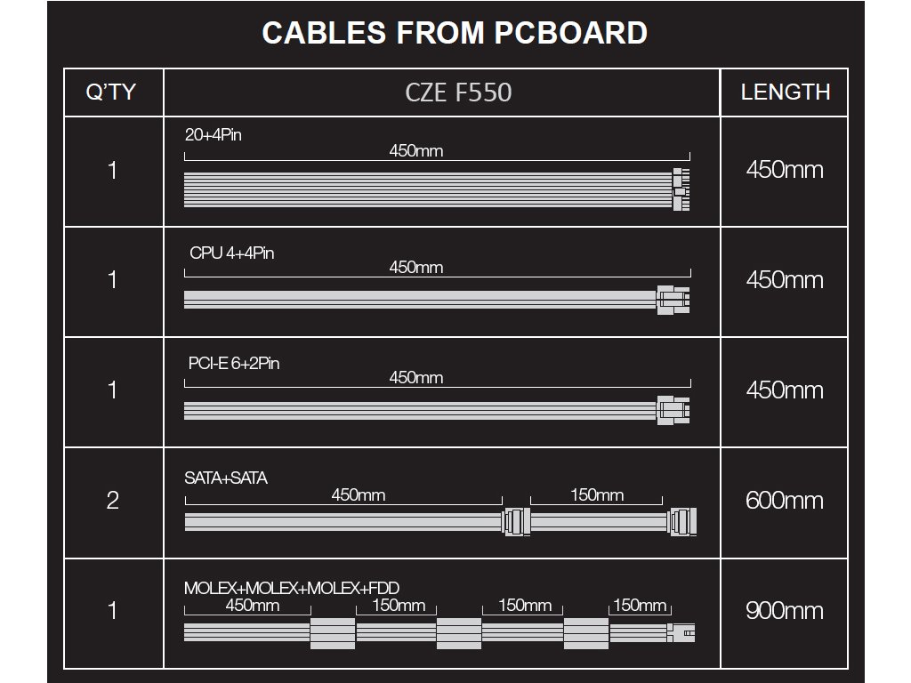 Specifikace • Ventilátor 14 cm, zelený • Aktivní PFC • Certifikace 80+ • Účinnost minimálně 82%/85%/82% při zatížení 20%/50%/100% • Ochrana proti zkratu, přetížení, přepětí a podpětí Kabeláž • 1x MB 20+4pin 450 mm • 1x cpu 4pin (8pin - 4+4) 450 mm • 1x VGA PCI-E 6+2pin 450 mm • 1x MOLEX, 450mm + MOLEX 150mm + MOLEX 150 mm + FDD 150 mm • 2x kabel S-ATA 450mm+ S-ATA150mm • černá barvaDodatočné parametre