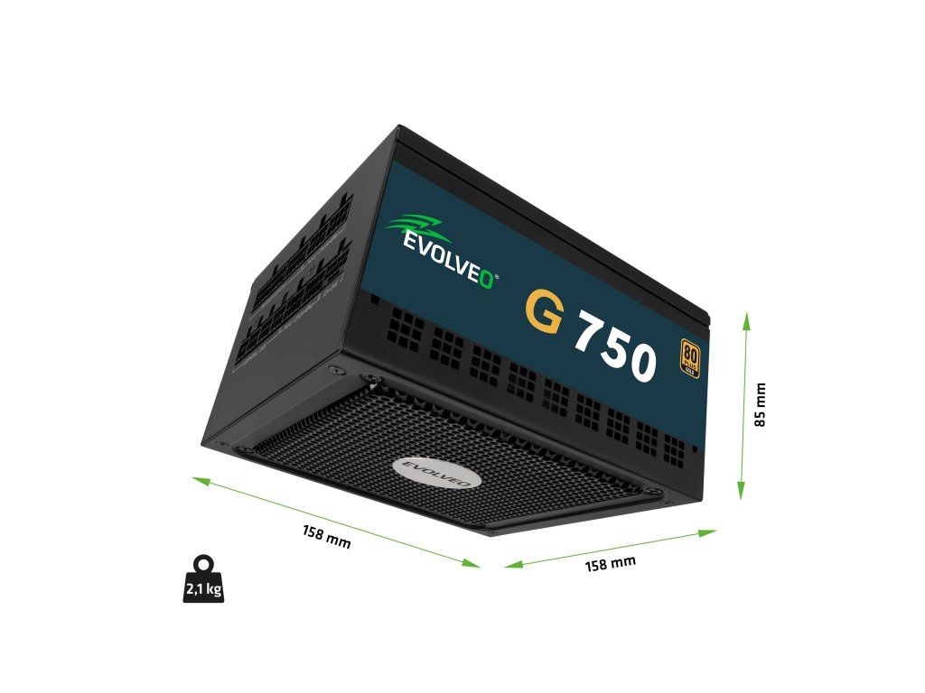 Se šířkou pouhých 158 mm se zdroj EVOLVEO G750-BK vejde i do menších PC skříní či stylových towerů. Přitom si zachovává sílu 750W, takže utáhne i grafiku aktuální generace – třeba NVIDIA® GeForce RTX™ řady 40 nebo 50. . Celkové dojmy z tohoto počítačového zdroje pak dotahuje k dokonalosti robustní konstrukce s plechy o tloušťce 0,7 mm nebo kvalitně zpracovaný hlavní síťový vypínač. Vzhledem k certifikacím LVD, EMC a RoHS zdroj odpovídá nejpřísnějším evropským normám. Ať už tak stojíte před jakýmkoliv úkolem, zaručeně vás podrží – jako spolehlivý parťák pro všechna dobrodružství ve světě jedniček a nul.Specifikace:
