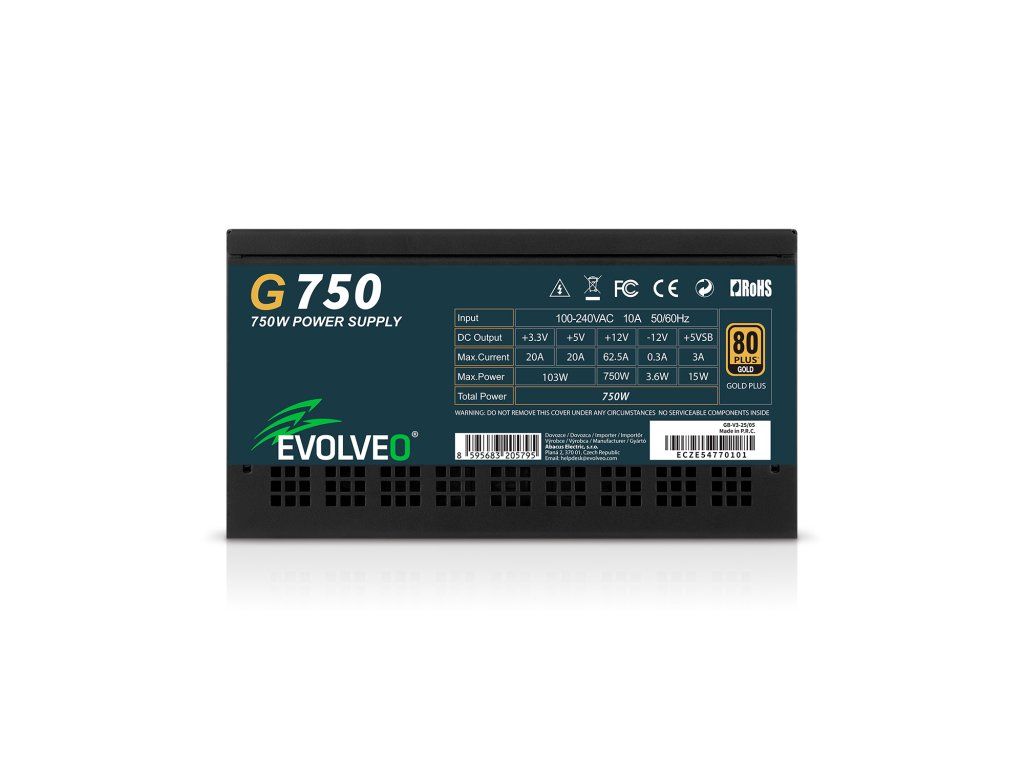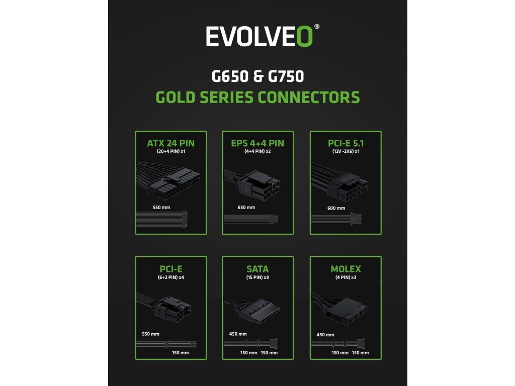 EVOLVEO G750 zdroj 750W, 80+ GOLD, ATX 3.1, aPFC, 140 mm ventilátor G750-BK Evolveo