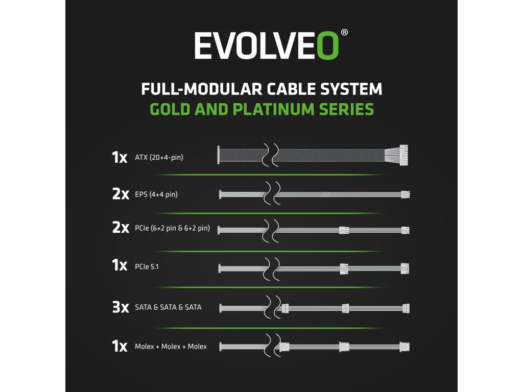 Zapomeňte na zamotané kabely, které brání proudění vzduchu a ještě vaší počítačové skříni kazí styl. Zdroj EVOLVEO G750-BK je plně modulární, takže k němu připojíte jen ty kabely, které opravdu potřebujete. Součástí balení jsou všechny důležité šňůry – jeden kabel ATX 24 PIN, dva EPS 4+4 PIN, dva PCI-E 6+2 PIN, jeden PCI-E 5.1 12V-2×6, tři SATA a jeden MOLEX. Díky tomu máte místo na vše od CPU a GPU přes disky až po vymazlené LED pásky či jiné extra prvky.Vstupní napětí zdroje činí 100–240 V. Součástí zařízení je přitom i 230V vstup na síťový kabel (tento kabel je součástí dodávky).Cool faktor vaší sestavy