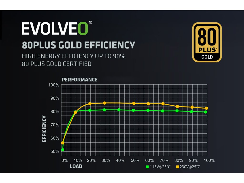 PC zdroj EVOLVEO G850-BK je hrdým držitelem certifikace 80 PLUS Gold, která slibuje až 92% účinnost (při běžném 50% zatížení). Minimální ztráty energie a nízké zahřívání jdou přitom ruku v ruce s tichým chodem 140mm HDB ventilátoru – ten má mezi hřídelí a ložisky speciální olejovou vrstvu a jeho tření je nepatrné, takže hlučnost zůstává na minimu. S tímto zdrojem vás zkrátka hučení ventilátoru neruší – slyšet je jen svištění kol vaší formule nebo řinčení zbraní vaší armády.Prémiové japonské kondenzátory, jimiž je tento zdroj vybaven, jsou spolehlivé a extra výkonné. Navíc odolávají teplotám až 105 °C. A jejich životnost? Až 20 let! I díky nim se můžete bezhlavě (ale taky bez obav) pustit do jakékoliv herní výzvy.Modularita, která přináší svobodu