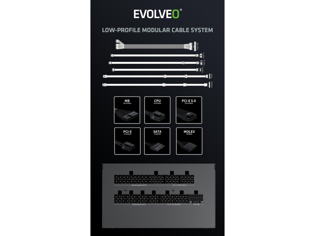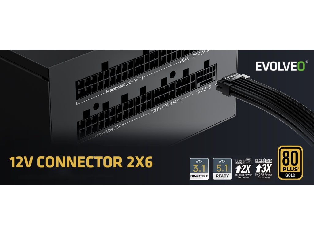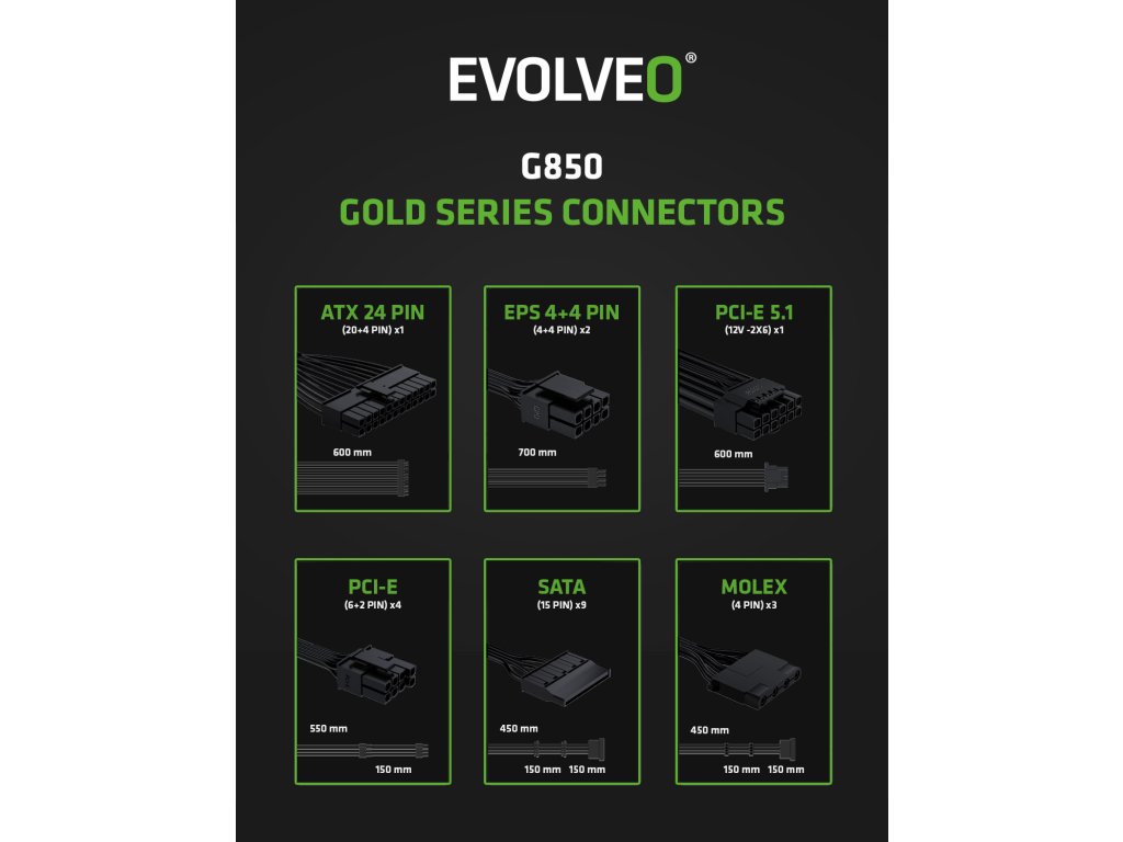 EVOLVEO G850, zdroj 850w, 80+ GOLD, ATX 3.1, aPFC, 140 mm ventilátor