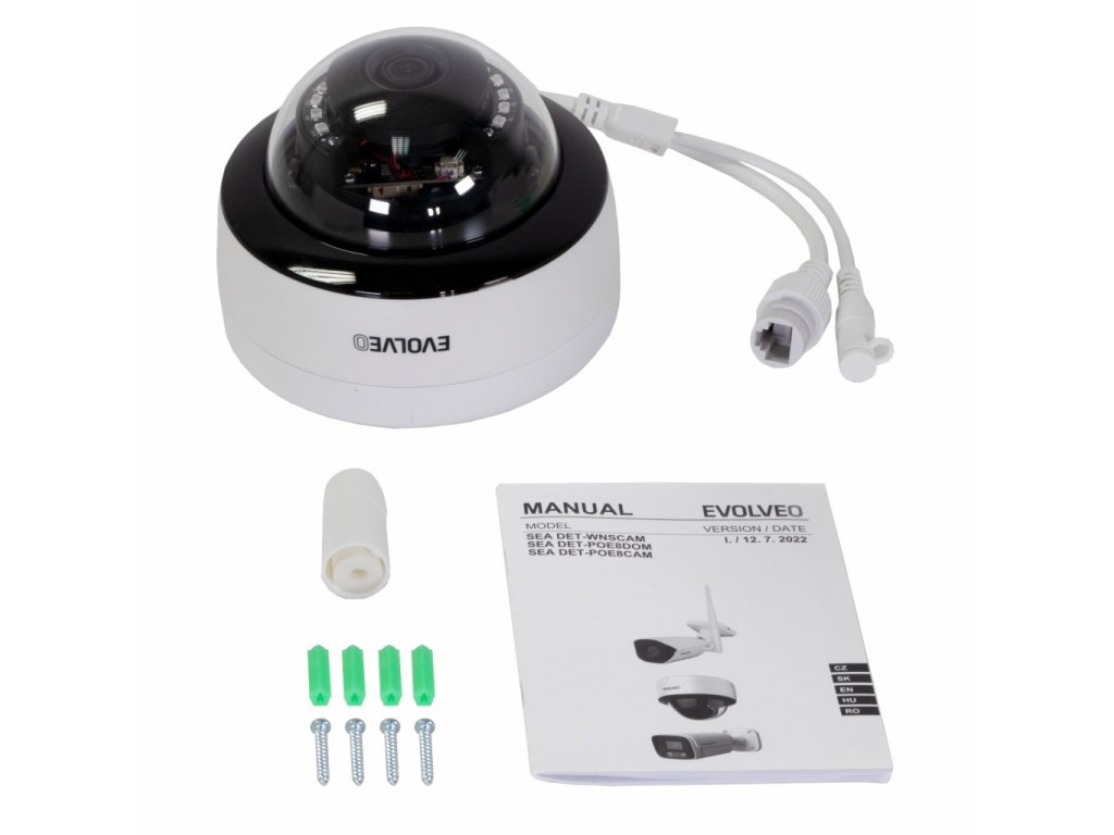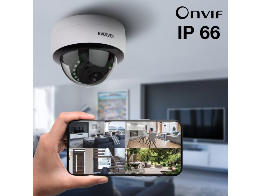 Základna kamery je vyrobena z hliníkové slitiny a kopule je z tvrzeného odolného plastu, který je odolný vůči UV záření. Lze ji montovat jak v interiérech, tak i ve venkovním prostředí. Kamera je vybavena 2Mpx snímačem, který umožňuje přenos obrazu v kvalitě FULL HD 1920x1080p, IR přísvit se skládá z 12 ks IR LED s vlnovou délkou 850nm, které vystačí na osvit prostoru do 20M od místa instalace. Součástí balení je i spojovací materiál pro snadnou montáž. Kameru lze manuálně natočit, tak aby zabírala vámi vybrané místo. Kameru lze spárovat s NVR kamerovými systémy EVOLVEO Detective řady SMART. Kameru lze použít i samostatně s jakýmkoliv kamerovým systémem, který podporuje standart ONVIF.SPECIFIKACE: