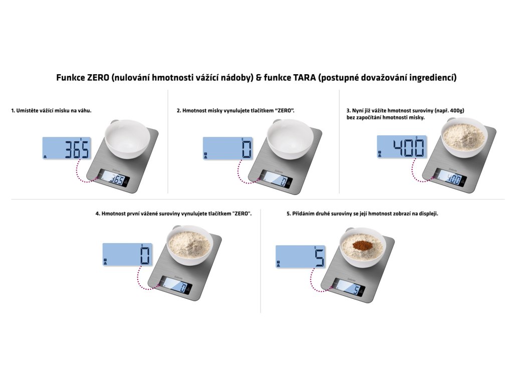 Funkce ZERO (nulování hmotnosti vážicí nádoby) & funkce TARA (postupné dovažování ingrediencí)
