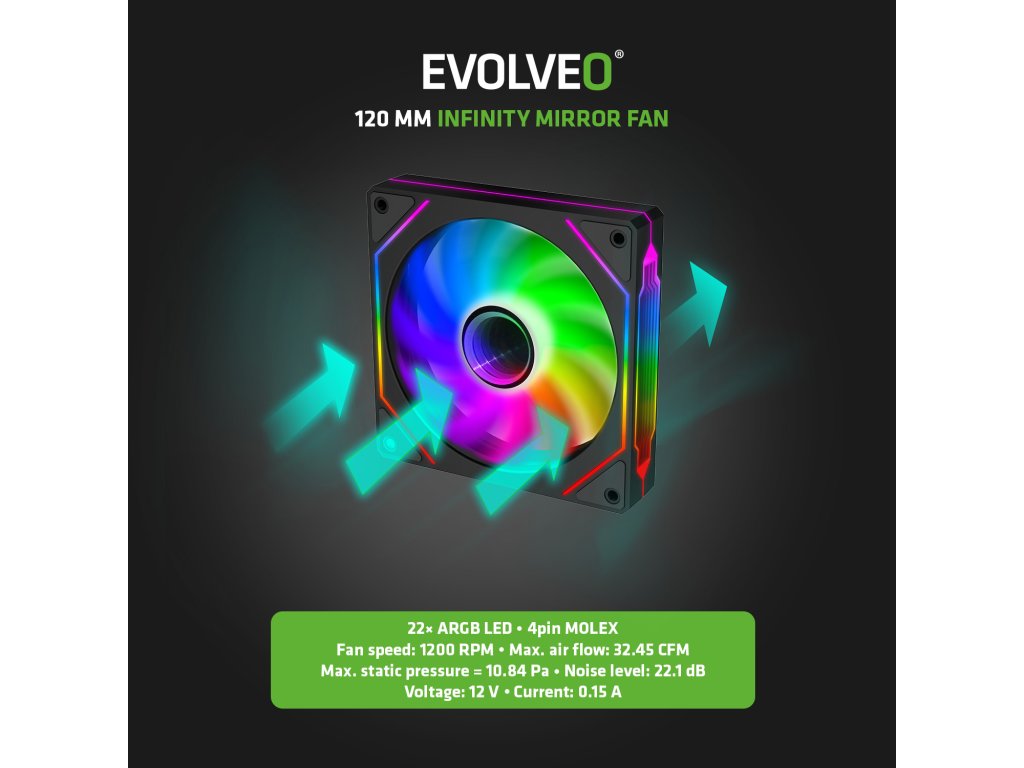 Tato PC skříň je sídlem nejen pro váš hardware, ale i pro čtveřici ventilátorů Infinity Mirror. Ty jsou strategicky rozmístěny a perfektně vyzbrojeny pro boj proti přehřívání počítače, ovšem jak je u EVOLVEO Scorpio-BK-4 dobrým zvykem, dbají i na eleganci. Zdobí je Multi ARGB podsvícení s 22 LED diodami (8 uprostřed a 14 na vnějším obvodu každého ventilátoru), doplněné o působivý zrcadlový design. Díky soustavě zrcadel se světlo odráží a znásobuje, až se vám zdá, že v PC skříni svíti stovky žároviček. Jde o opravdu úchvatný efekt, který dává herní atmosféře tu pravou šťávu. Styl podsvícení ventilátorů můžete nechat na vaší základní desce nebo ho mít díky tlačítku v pravé horní části skříně ve vlastní režii. K dispozici máte 14 barevných režimů, od jednobarevného osvětlení přes decentní prolínání barev až po futuristické blikací módy.Tiché a spolehlivé chlazení