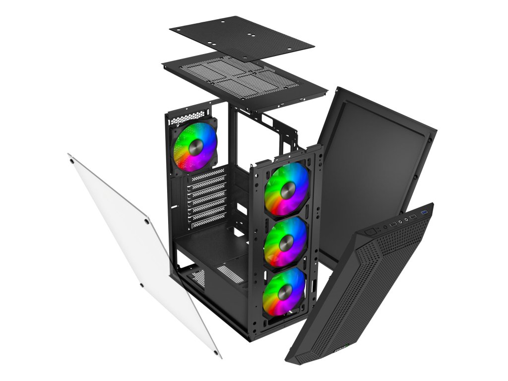 • Midi Tower • ATX, mATX, mITX • Mesh čelní panel s nacvakávacím mechanismem • Bočnice z temperovaného skla • 4x Ventilátory ARGB 120 mm • Dva prachové filtry • VGA max. 330 mm • CPU max. 170 mm • 2x 3,5''HDD, 3x 2,5''SSD • 3x USB, 2x Jack