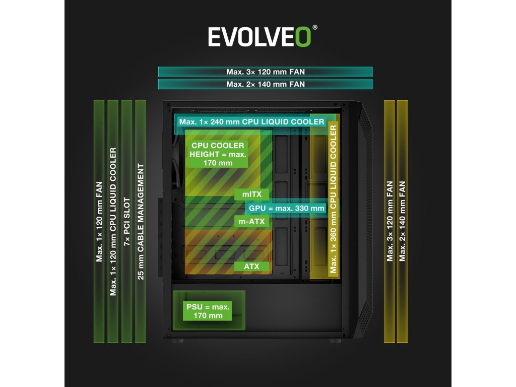 Aby vaše výkonné komponenty nedostaly srdeční záchvat z přehřívání, nachází se v PC skříni EVOLVEO Xenon-WH-4 chladicí systém QuintFlow. Ten zahrnuje pět promyšleně zorganizovaných vzduchových proudů přes čelní, horní, spodní, zadní a boční voštinové průduchy – díky nim vzduch postupně chladí všechny důležité součástky a počítač si udržuje teplotu, která umožňuje nerušené hraní. Vzduch proudí skříní, jak je třeba, i díky odnímatelnému meshovému čelnímu panelu, na němž oceníte i snadnou montáž a demontáž pomocí nacvakávacího mechanismu ClickFix. A kdyby bylo potřeba chlazení ještě posílit, potěší vás i možnost instalace dalších ventilátorů a chladičů.Místo pro váš vysněný hardware