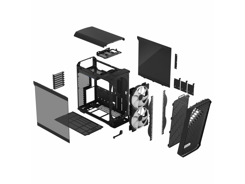 Fractal Design Torrent Compact Torrent Compact je zkonstruován tak, aby co nejefektivněji chladil vaši kompaktní sestavu vzduchem díky otevřené přední mřížce a dvěma našim ventilátorům 180 x 38 mm Dynamic PWM (Prisma pro verzi RGB), což z něj dělá ideální volbu pro milovníky vzduchového chlazení, kteří hledají kompaktní skříň. *Otevřená mřížka a 180mm přední ventilátory optimalizované pro maximální přívod vzduchu *Ventilátory Fractal Design Dynamic PWM / Prisma ARGB PWM 180 x 38 mm využívají výkon, velikost a tloušťku pro masivní výkon při pohybu vzduchu. *Rozsáhlé nasávací otvory základny a mimořádně velká spodní podpora ventilátorů nabízí výjimečný potenciál chlazení GPU (s volným spodním slotem PCI) Rozměry: 450 x 222 x 467 mm Formát zdroje: ATX Podpora základních desek: E-ATX (up to 274 mm) / ATX / mATX / Mini-ITX / SSI-CEB Počet slotů 2,5''/3,5'': 1x 3.5/2.5 mm HDD slot + 3x vyhrazený 2.5'' HDD slot Rozšiřující sloty: 7 Čelní porty: *1x USB 3.1 Gen 2 Type-C *2x USB 3.0 *Audio Chlazení 2x 180, 2x 140 mm nebo 3x 120 mm Barva: RGB černá Hmotnost: 8 kg