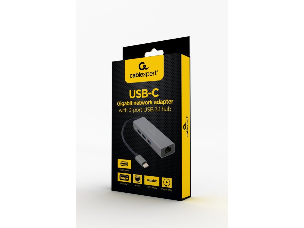 USB-C Gigabitový síťový adaptér, 1x LAN, 3x USB 3.0 HUB *Jednoduchá instalace Plug & Play *Ideální pro notebooky, které neobsahují vestavěný port LAN (RJ45) *Poskytuje rychlé síťové připojení Gigabit ethernet a přenos dat prostřednictvím USB 3.0 HUB *USB-C Gigabit síťový adaptér s 3-portovým rozbočovačem USB *Podporuje Gigabit LAN připojení s rychlostí 10/100/1000 Mbps *Integrovaný rozbočovač USB 3.0 s 3 porty (5 Gbps) *Odolné, stylové kovové tělo *Plug & Play