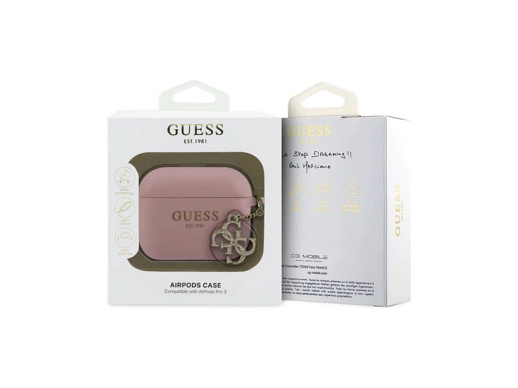 Puzdro je vyrobené z odolného silikónu s logom Guess a štýlovým zlatým príveskom.