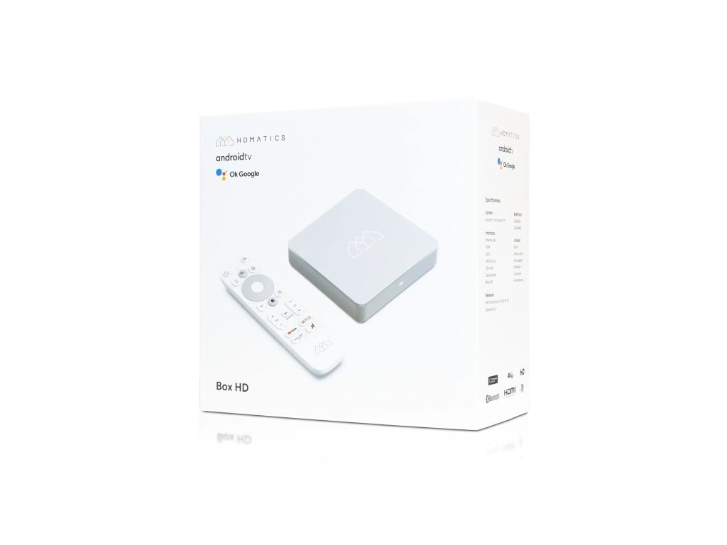 Homatics Box HD patří mezi nejvýkonnější HD multimediální zařízení na trhu, který z obyčejné TV udělá výkonný smart TV. Operačním systémem je oficiální Android TV 11. V tomto malém zařízení se skrývá výkonný procesor Amlogic S805X2, kterému činí podporu 1,5GB DDR RAM a až 32GB eMMC Flash.