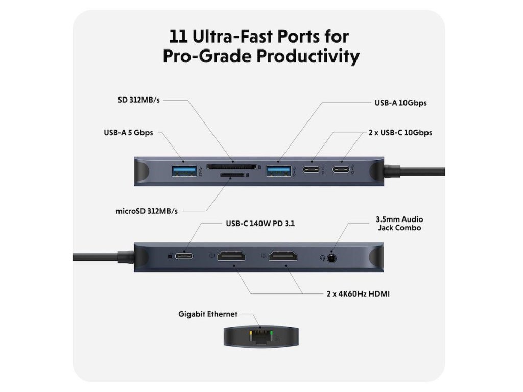 Hyper® EcoSmart™ Gen.2 Dual HDMI USB-C 11-in-1 Hub 140W PD 3.1 Pass-thru HY-HD4006GL NoName