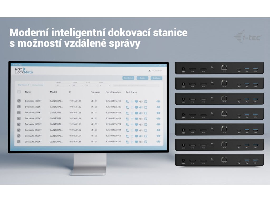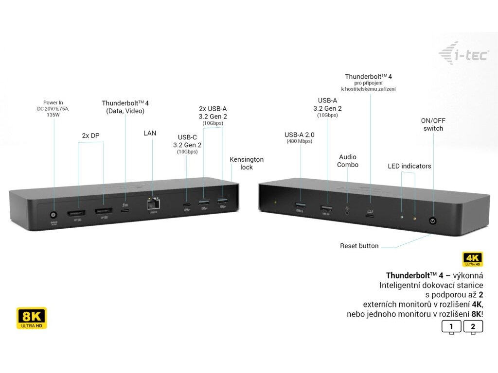 • Průlomová dokovací stanice s plnohodnotnou funkcí vzdálené správy • Tato výkonná univerzální dokovací stanice je vybavena dedikovaným LAN portem, který umožňuje kompletní vzdálené ovládání — včetně správy na úrovni jednotlivých portů — odkudkoli. Správa funguje i bez připojení k hostitelskému zařízení — stačí pouze napájení a LAN. • Software pro vzdálenou správu (pro Windows) je k dispozici jako volitelný doplněk a lze jej dokoupit kdykoli. • Samozřejmě, i bez něj dokovací stanice funguje plnohodnotně — jediným rozdílem je absence funkce vzdálené správy. • Kompatibilní se všemi moderními notebooky vybavenými porty Thunderbolt™, USB4 nebo USB-C. • Podporuje rozlišení až 8K nebo dva 4K monitory s obnovovací frekvencí až 60 Hz. • Poskytuje napájení až 90 W připojenému notebooku nebo tabletu. • Nabízí univerzální konektivitu: 1× Thunderbolt™ 4 port a 5× USB portů (1× USB-C, 4× USB-A) pro snadné připojení zařízení a periferií. • Zajišťuje extrémně rychlý přenos dat rychlostí až 40 Gbps (?4 GB/s). • Inteligentní gigabitový Ethernet poskytuje ultra rychlé kabelové připojení 10/100/1000 Mbps s pokročilými funkcemi vzdálené správy. • Kombinovaný 3,5mm audio/mikrofonní konektor podporuje náhlavní soupravy a další audio zařízení s integrovaným mikrofonem. Zažijte průlom v dokovacích technologiích s výkonnou univerzální dokovací stanicí navrženou pro plnohodnotnou vzdálenou správu. Díky dedikovanému LAN portu mohou IT administrátoři dokovací stanici spravovat odkudkoli*. Software pro vzdálenou správu je k dispozici jako volitelný doplněk a lze jej zakoupit kdykoli. Samozřejmě, i bez něj dokovací stanice funguje naplno — jediným omezením je absence funkcí vzdálené správy. A to nejlepší: správa funguje i bez připojení k hostitelskému zařízení — stačí pouze napájení a LAN. Poznámka: Software je dostupný pouze pro počítače se systémem Windows. Nová generace vysokovýkonné dokovací stanice Thunderbolt“ 4 umožňuje připojit až dva externí monitory v rozlišení 4K nebo jeden displej v rozlišení 8K. Je kompatibilní s prakticky všemi notebooky vybavenými porty USB-C**, USB4 nebo Thunderbolt“ 3/4/5 a podporuje všechny hlavní operační systémy. Díky množství USB portů (včetně USB 3.2 Gen 2 s rychlostí až 10 Gbps), portu Thunderbolt“ 4 nabízejícímu buď výstup v 8K, nebo ultra rychlý přenos dat 40 Gbps, a spolehlivému vysokorychlostnímu LAN připojení je tato dokovací stanice ideálním řešením pro náročné profesionály. Samozřejmostí je také podpora napájení až 90 W pro nabíjení notebooku nebo tabletu. • Připojení jednoho 8K displeje nebo až dvou externích monitorů v rozlišení 4K** • Napájení až 90 W (Power Delivery) • 2× DisplayPort a 1× Thunderbolt“ 4 port • 5× USB portů: 1× USB-A (10 Gbps, BC 1.2 rychlé nabíjení), 2× USB-A (10 Gbps), 1× USB-A (2.0) a 1× USB-C (Gen 2, 10 Gbps) • Inteligentní gigabitový Ethernet (RJ-45) zajišťuje spolehlivé a rychlé připojení s podporou 10/100/1000 Mbps a pokročilými funkcemi vzdálené správy • Kombinovaný 3,5mm audio/mikrofonní konektor • Slot pro zámek Kensington poskytuje ochranu proti krádeži, ideální pro sdílené kanceláře nebo veřejné prostory • Vypínač na dokovací stanici umožňuje maximální úsporu energie • Podpora pro Windows 10/11, macOS, iPadOS, Android, ChromeOS a Linux (nejnovější verze) Specifikace : • 1× Thunderbolt™ 4 port pro připojení k notebooku • Volitelné klíčové funkce vzdálené správy*: • Automatická detekce dokovací stanice v rámci stejného LAN segmentu • Přehled všech dokovacích stanic a jejich stavu • Vzdálená instalace a aktualizace firmwaru • Možnost automatického vypnutí dokovací stanice při odpojení od hostitelského zařízení • Software je kompatibilní s počítači se systémem Windows 10/11 • Technologie dokovací stanice: Thunderbolt™ 4 + USB-C PD • Power Delivery: až 90 W • Video porty: 2× DisplayPort, 1× TB4 (data, video) • Rozlišení: Hostitelské zařízení Thunderbolt™ 3/4/5 nebo USB4 s podporou DisplayPort 1.4: 1 monitor: 1× DP nebo TB4 › až 8K/30 Hz** 1× DP nebo TB4 › až 4K/144 Hz nebo 1440p/240 Hz nebo 1080p/360 Hz 2 monitory: DP + TB4 nebo 2× DP › až 2× 4K/60 Hz DP + TB4 nebo 2× DP › až 1440p/144 Hz Hostitelské zařízení Thunderbolt™ 3 s podporou DisplayPort 1.2: 1 monitor: 1× DP nebo TB4 › až 5K/60 Hz 1× DP nebo TB4 › až 4K/144 Hz nebo 1440p/240 Hz nebo 1080p/360 Hz 2 monitory: DP + TB4 nebo 2× DP › až 2× 4K/60 Hz DP + TB4 nebo 2× DP › až 1440p/144 Hz Hostitelské zařízení USB-C s podporou DisplayPort 1.4: 1 monitor: 1× DP nebo TB4 › až 4K/60 Hz 1× DP nebo TB4 › až 1440p/144 Hz Hostitelské zařízení USB-C s podporou DisplayPort 1.2: 1 monitor: 1× DP nebo TB4 › až 4K/30 Hz 1× DP nebo TB4 › až 1080p/120 Hz • 1× USB-A 3.2 Gen 2 (10 Gbps) s podporou rychlého nabíjení (BC 1.2) • 2× USB-A 3.2 Gen 2 (10 Gbps) • 1× USB-A 2.0 (480 Mbps) • 1× USB-C 3.2 Gen 2 (10 Gbps) • 1× Ethernet RJ-45 1 Gbps port • 1× 3,5mm kombinovaný audio/mikrofonní konektor • 1× napájecí vstup (DC 20 V / 6,75 A, 135 W) • LED indikátor • Tlačítko ON/OFF pro zapnutí/vypnutí dokovací stanice • Podpora zámku Kensington • Thunderbolt™ 4 kabel (100 cm) • OS: Windows 10 / 11, macOS, Android**, iPadOS**, ChromeOS, Linux • Rozměry produktu: 220 × 75 × 30 mm • Hmotnost produktu: 295 g Hardwarové požadavky: • Zařízení s volným portem USB-C, USB4 nebo Thunderbolt™ 3/4/5 Požadavky na Power Delivery: • Zařízení s volným portem USB-C, USB4 nebo Thunderbolt™ 3/4/5 s podporou Power Delivery Požadavky na video výstup: • Zařízení s volným portem USB-C nebo USB4 s