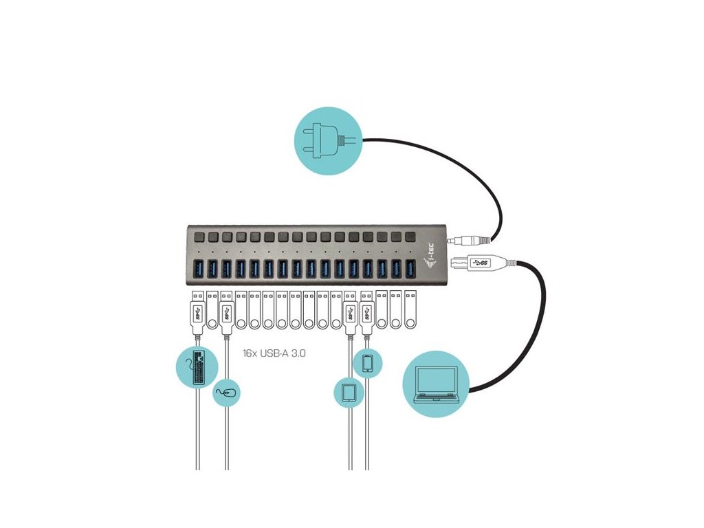 Tento HUB nabízí 16 USB 3.0 portů s funkcí Plug & Play a standardním USB nabíjením – HUB automaticky detekuje, jestli je připojeno zařízení pro USB nabíjení. Díky tomu, že HUB má 16 USB 3.0 portů, je možno nabíjet až 16 zařízení najednou. Rozhraní USB 3.0 je důležité zejména pro datové přenosy z USB 3.0 paměťových karet a flash disků, kde se nejvíce využije jeho vysoká přenosová rychlost. K balení je přiložen externí napájecí adaptér, který vám zaručí stabilní nabíjení z USB portů a výkon HUBu, poskytující nabíjecí výkon až 10 W na jeden port.