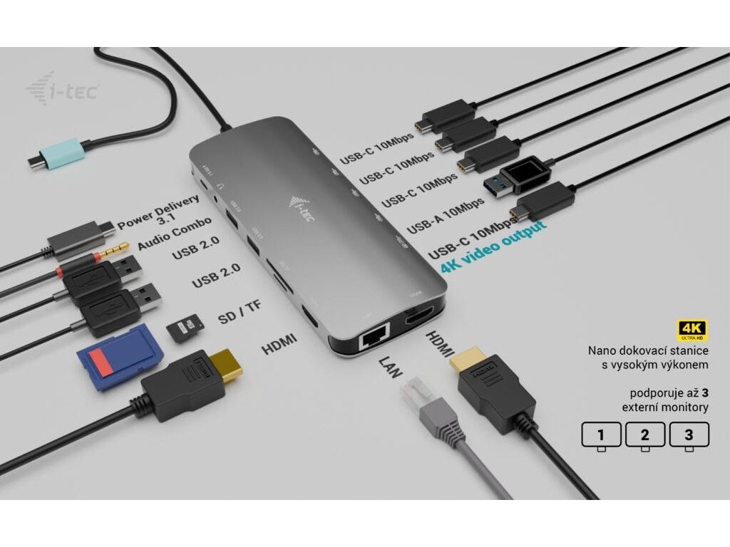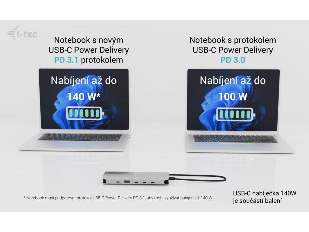 i-tec USB-C Metal Nano 3x Display Dock, 2x HDMI 1x USB-C video, PD 140W + Universal Charger 140W C31NANOTRIPLED140 I-Tec