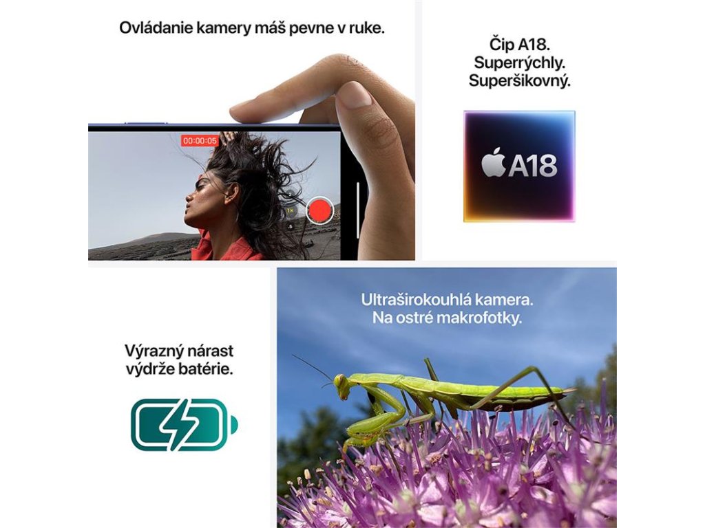 MIMORIADNE INTELIGENTNÝ ČIP A18—Čip A18 je o dve generácie pred čipom A16 Bionic z iPhone 15. Umožňuje pokročilé funkcie fotografovania a videa a podporuje hranie na úrovni konzol s mimoriadnou energetickou účinnosťou.