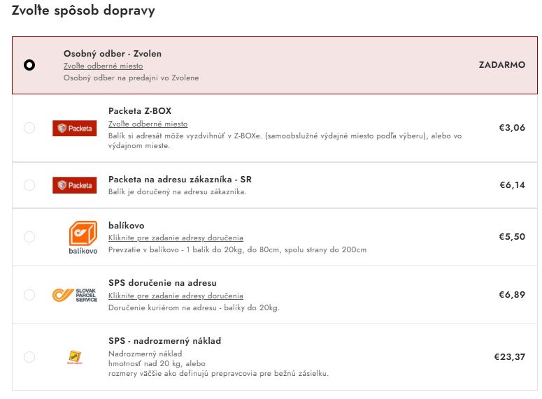 Náhľad spôsobu výberu dopravy a platby v procese zadávania Vašej objednávky :