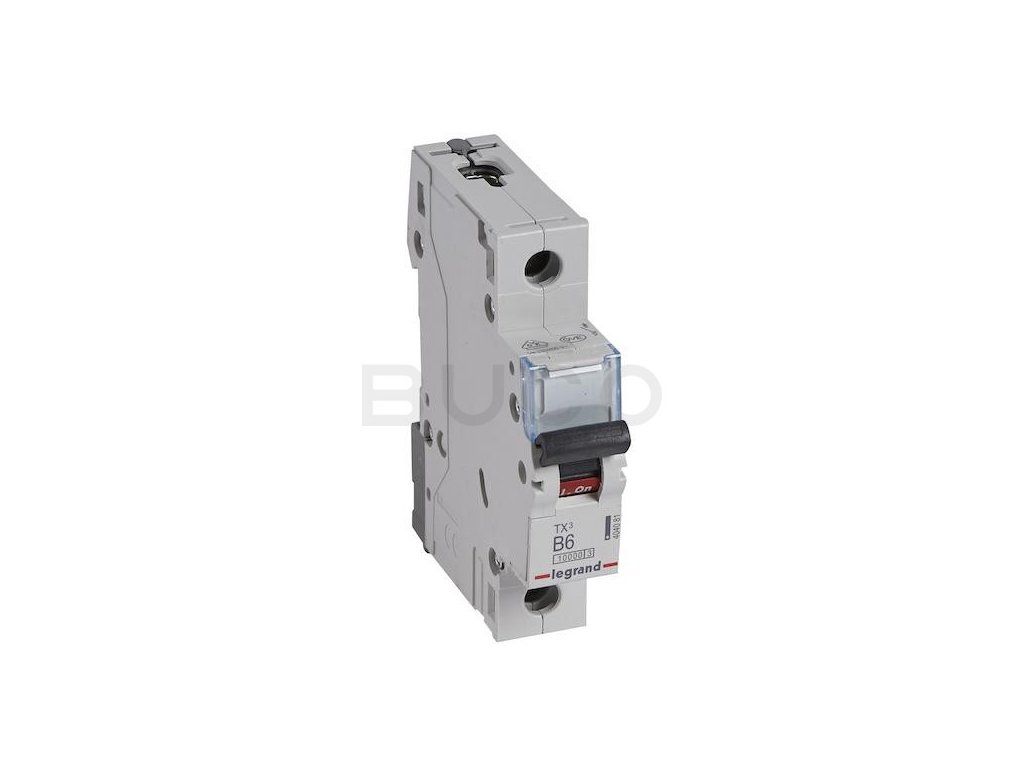 Istič Legrand TX 404081 jednopólový s popisným polom, charakteristika B. Skratová odolnosť 10000 A (10 kA) podľa STN EN 60898-1 (230/400 V AC) a STN EN 60947-2 (230/400 V AC). S možnosťou pripojiť pomocné a signalizačné kontakty, podpäťové a vypínacie spúšte. Kompatibilné s kolíkovými aj vidlicovými prepojovacími hrebeňmi.