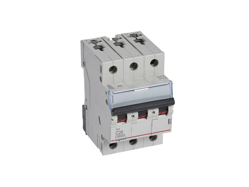 Istič Legrand TX 404223 trojpólový s popisným polom, charakteristika C. Skratová odolnosť 10000 A (10 kA) podľa STN EN 60898-1 (230/400 V AC) a STN EN 60947-2 (230/400 V AC). S možnosťou pripojiť pomocné a signalizačné kontakty, podpäťové a vypínacie spúšte. Kompatibilné s kolíkovými aj vidlicovými prepojovacími hrebeňmi.