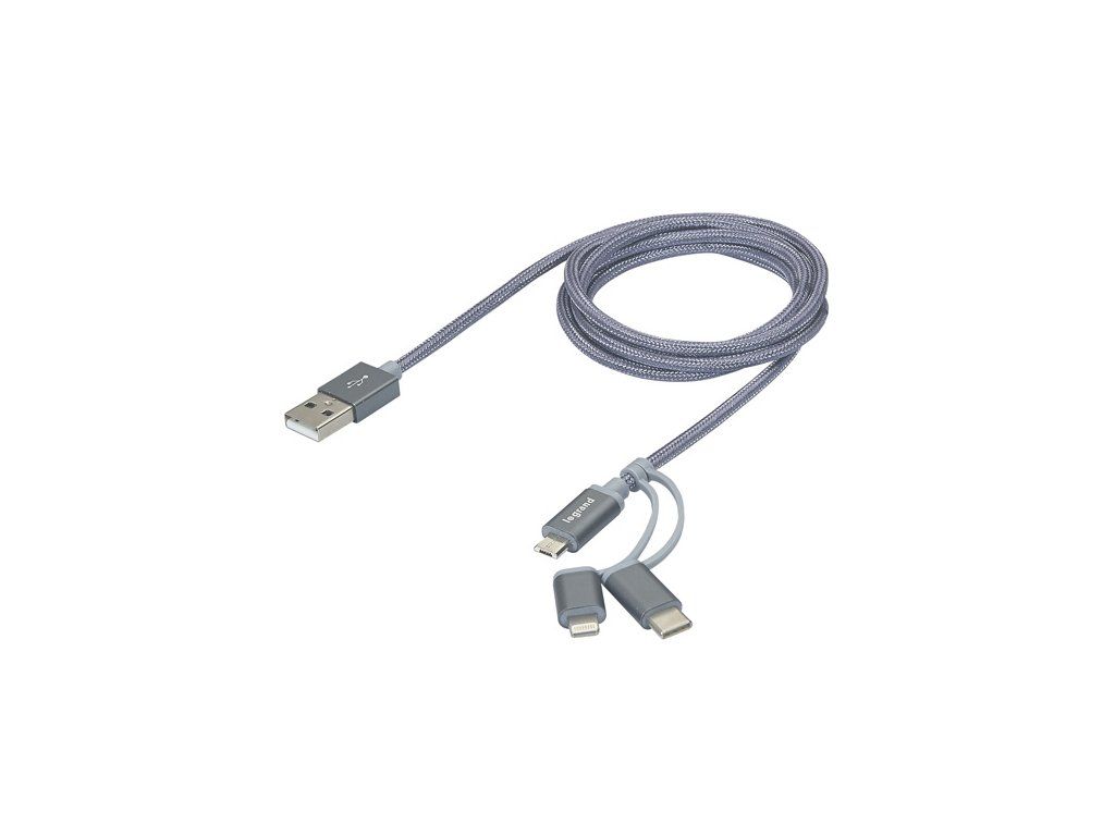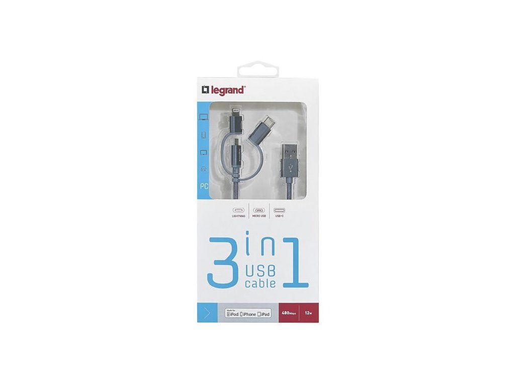 USB kábel 3v1 značky Legrand podporuje pripojenie, nabíjanie a synchronizáciu až 3 rôznych zariadení prostredníctvom 3 rôznych konektorov. Samozrejmosťou je podpora rýchleho nabíjania až do 2 400 mA a dátového prenosu až do 480 Mbps. Pletené prevedenie kábla dlhého až 120 cm bráni jeho zalomeniu pri pravidelnom používaní.