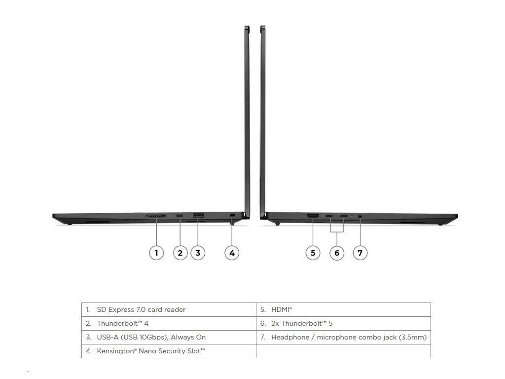 Typ zariadenia:Notebook; Operačný systém:Windows 11 Pro; Typ procesora:Intel Core Ultra 7; Grafický čip:NVIDIA RTX PRO 2000; Rozlíšenie:1920x1200; Formát obrazovky:16:10; Typ disku:SSD; Rozhranie:SD karta, USB 3.2 Gen 2, HDMI, 3.5mm Jack, Thunderbolt; Výbava:Wi-Fi, BlueTooth, TouchPad, Čítačka odtlačkov prstov, Podsvietená klávesnica, Web kamera