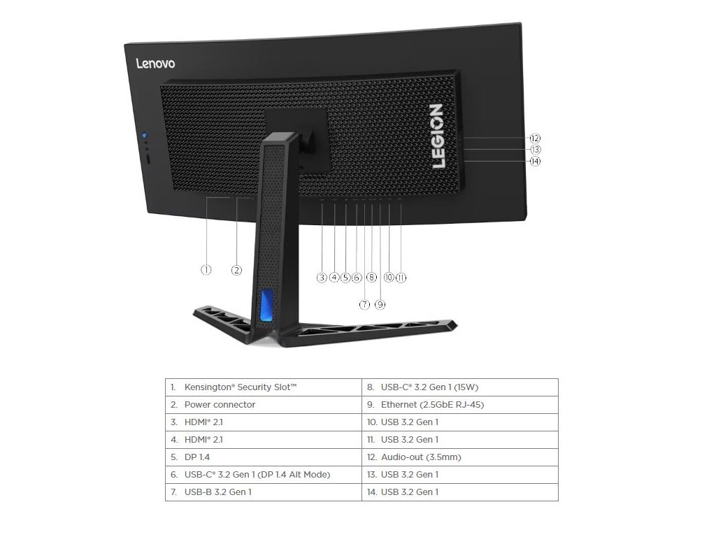 *1500R *Modular Camera Support *RGB Ambience Light *Factory Calibration: Avg. Delta E<2 *Brightness Calibration *ClearMR 7000 *Picture In Picture (PIP) / Picture By Picture (PBP) Support *DisplayHDR™ 1000 *True Split *Gaming Console Support *KVM Switch *Natural Low Blue Light *Lenovo® Artery (Lenovo Display Control Center) Support *VESA Adaptive Sync *AMD FreeSync™ Premium Pro *Smart Sense Typ obrazovky: Vertical Alignment Podsvícení: Mini-LED Úhlopříčka [palce]: 34'' Rozlišení: 3440 x 1440 Rozteč bodu [mm]: 0.077 x 0.232 mm Obnovovací frekvence [Hz]: 165Hz / 180Hz (Overclock) Poměr stran: 21:9 Povrch displeje: Anti-glare Jas [cd/m2]: 720 nits Kontrast: 3000:1 Odezva [ms]: 1 ms (MPRT) / 2 ms (Level 4) / 4 ms (Level 3) / 6ms (Level 2) / 8 ms (Level 1) / 11ms (Off mode) Pozorovací úhly (Horizontál/Vertikál): 178° / 178° Počet barev: 1.07 Billion Reproduktory: 5W x 2 Konektory: *USB Port: 4x USB 3.2 Gen 1, 1x USB-C® 3.2 Gen 1 (USB downstream), 1x USB-C 3.2 Gen 1 (DP 1.4 Alt Mode, USB upstream), 1x USB-B 3.2 Gen 1 (USB upstream) *Video Connector: 2x HDMI® 2.1, 1x DP 1.4, 1x USB-C® 3.2 Gen 1 (DP 1.4 Alt Mode) *Network Connectivity: 1x RJ45, Ethernet (10M/100M/1000M/2500M) Napájení: Integrated Spotřeba [W]: 55 W Montáž na zeď: Supports VESA mount 100mm Naklápění monitoru: Tilt, Swivel, Height Adjust Stand Barva: Raven Black Rozměry (se stojanem, ŠxVxH mm): 807.2 x 541.3 x 320.1 mm Hmotnost [kg]: 10.5 kg Záruka: 36 měs. https://psref.lenovo.com/Detail/Lenovo_Monitors/Lenovo_Legion_Y34wz_30?M=67B0UAC1EU