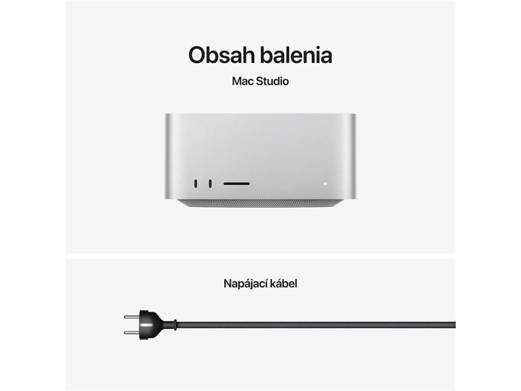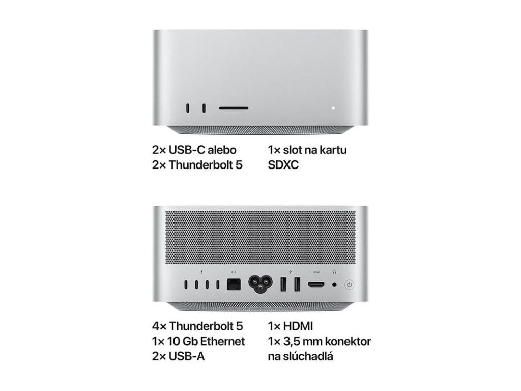 MÁ SILNÉ KONTAKTY – Mac Studio má až do šesť portov Thunderbolt 5, dva porty USB-A, port HDMI, slot na kartu SDXC a konektor na slúchadlá. Pripoj až päť externých displejov s čipom M4 Max alebo až osem s čipom M3 Ultra.