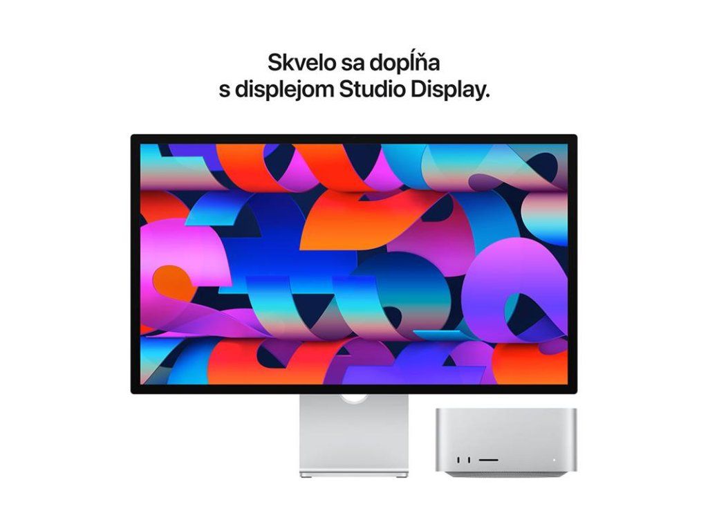 KRÁSNE SA ZMESTÍ NA STÔL – Kompaktné hranaté telo Macu Studio s hranou dlhou 19,7 cm skvele sadne pod väčšinu displejov.
